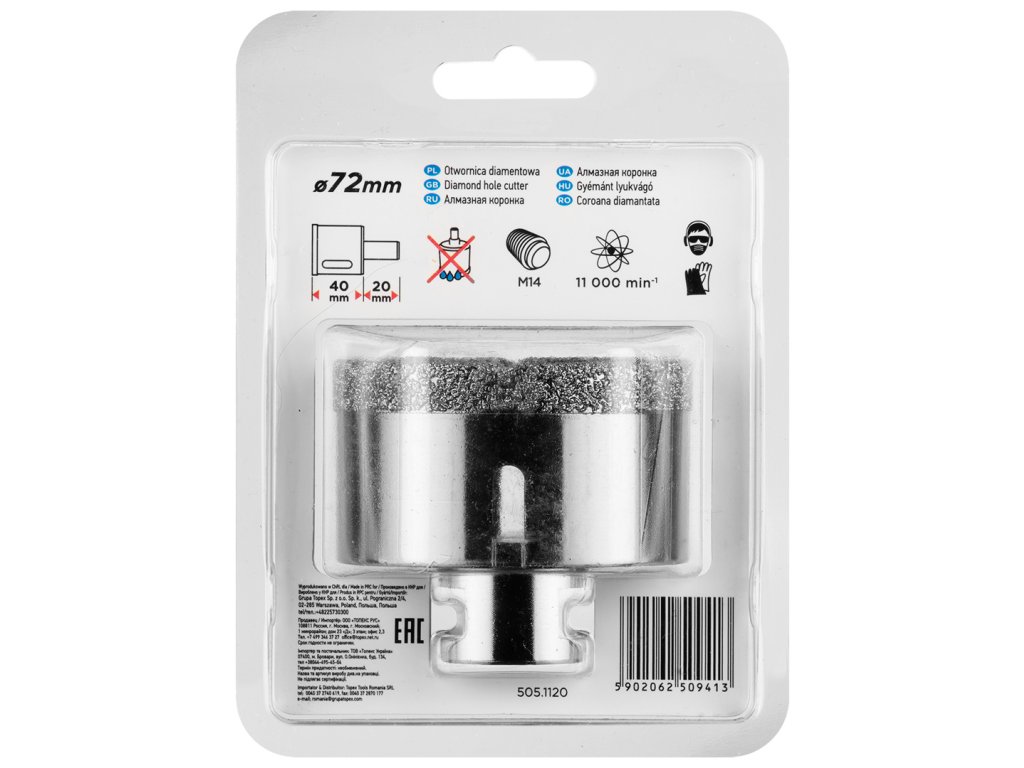 Diamantová píla na otvory GRAPHITE s priemerom 72 mm (ref. 55H316) so závitom M14 je určená na presné rezanie kameňa, kameniny, dlaždíc, skla, asfaltu, tehál a betónu. Vďaka použitiu diamantu sa rezná sila sústreďuje na malú plochu, čo eliminuje riziko prasknutia alebo poškodenia povrchu. Vhodné na prácu v suchu. Píla na otvory bola vákuovo spájkovaná pre zvýšenie odolnosti.