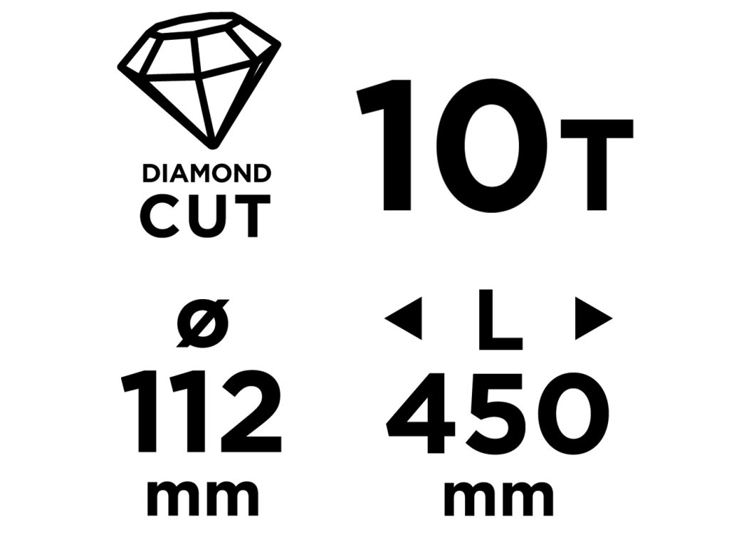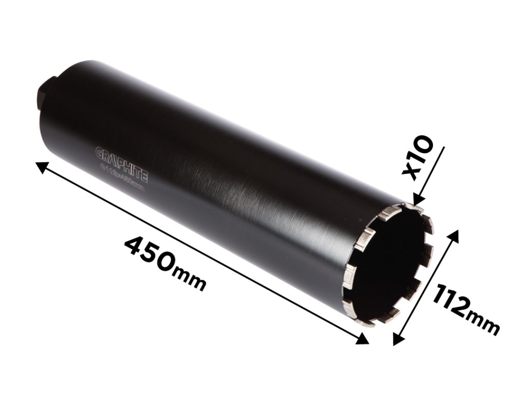 Diamantová vŕtacia píla 58G540 Priemer: 112 mm. Dĺžka: 450 mm. Počet zubov: 10T Závit: 1,1/4 UNC. Materiál tela: oceľ. Bezšvová rúrka, laserom zvárané zuby,. Zuby strešného segmentu, výška 10/11 mm. Použitie: betón, gelberon, keramika, žula, asfalt.