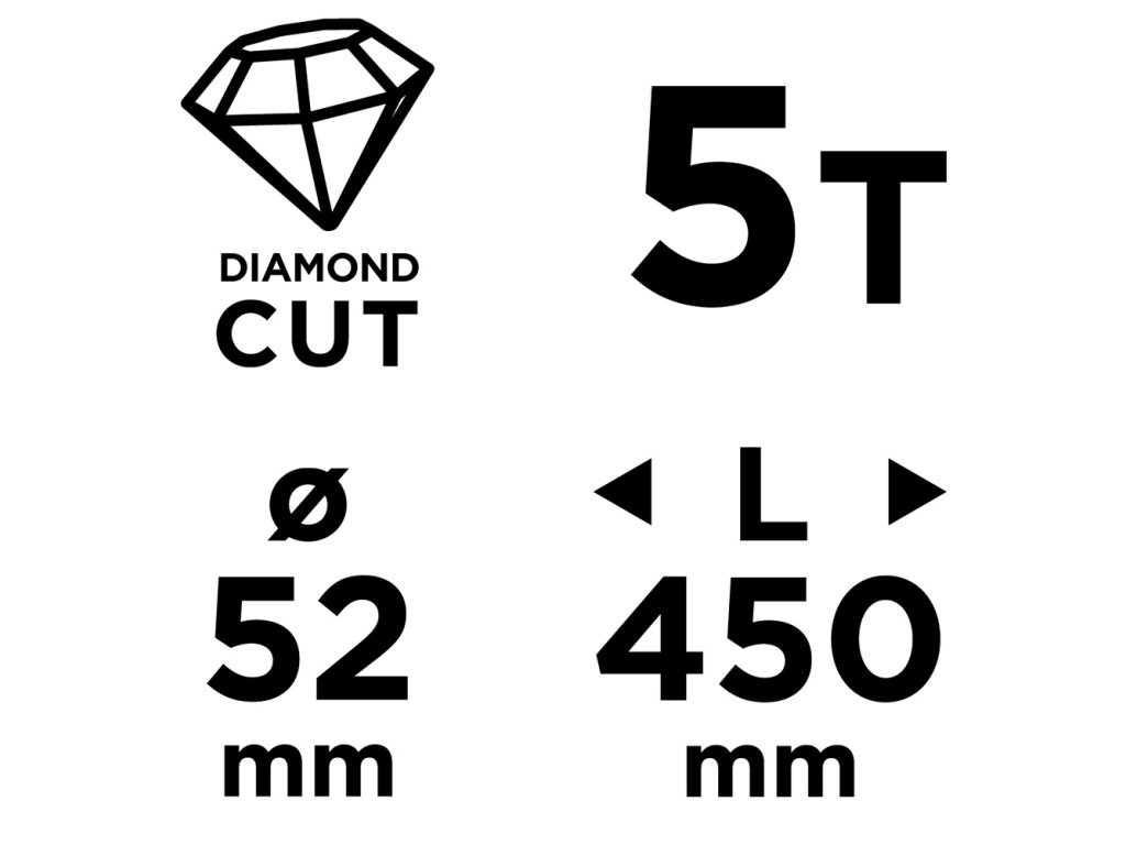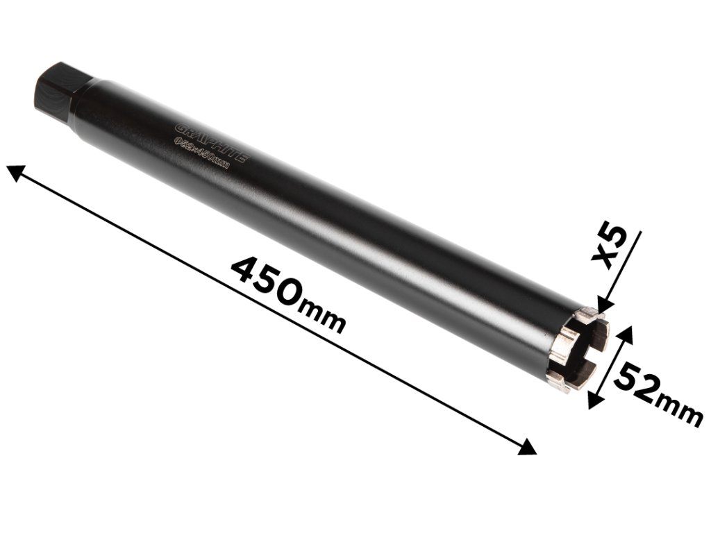 Diamantová vŕtacia píla 58G540 Priemer: 52 mm. Dĺžka: 450 mm. Počet zubov: 5T Závit: 1,1/4 UNC. Materiál tela: oceľ. Bezšvová rúrka, laserom zvárané zuby. Výška diamantových zubov 10 mm. Použitie: betón, gelberon, keramika, žula, asfalt.