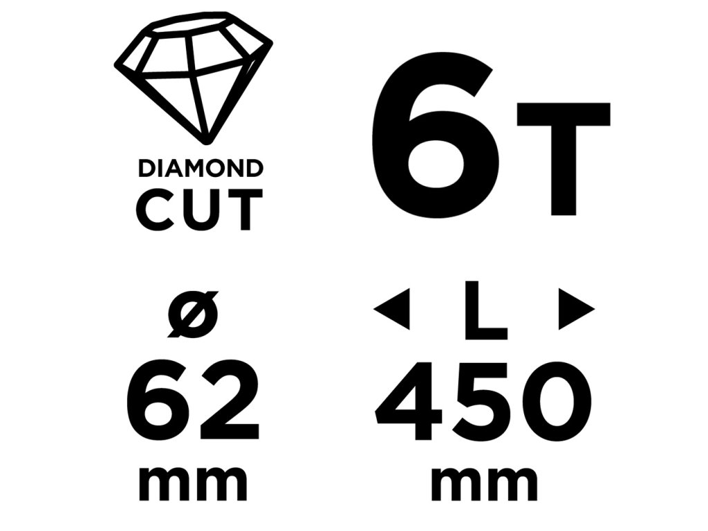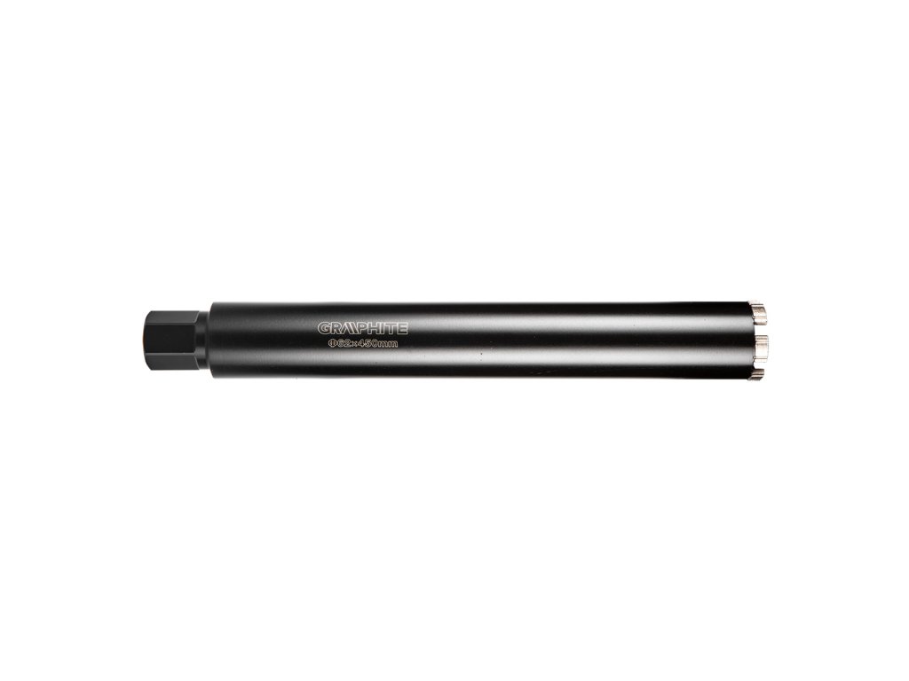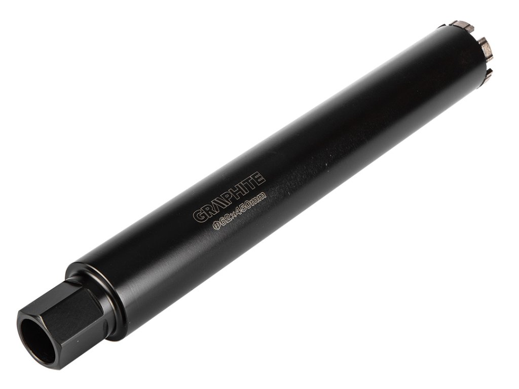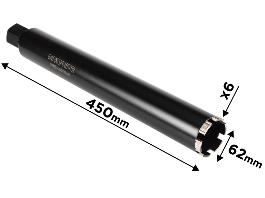 Diamantová vŕtacia píla 58G540 Priemer: 62 mm. Dĺžka: 450 mm. Počet zubov: 6T Závit: 1,1/4 UNC. Materiál tela: oceľ. Bezšvová rúrka, laserom zvárané zuby. Výška diamantových zubov 10 mm. Použitie: betón, gelberon, keramika, žula, asfalt.