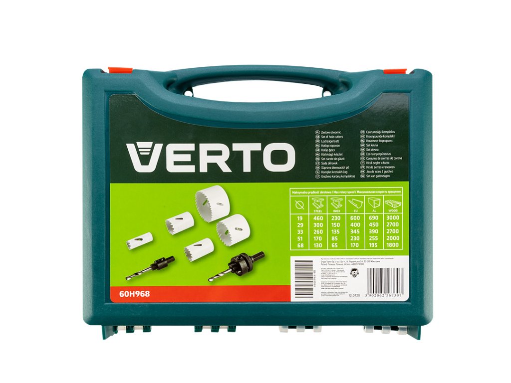 VERTO bimetalové pílky na diery (ref. 60H968), sada 7 kusov s veľkosťami od 19 do 68 mm. Vďaka zubom z rýchloreznej ocele umožňujú efektívne vŕtanie presných otvorov do ocele, nehrdzavejúcej ocele, dreva, plastov a kompozitov. Plastové puzdro umožňuje pohodlné uloženie súpravy. Značka VERTO ponúka sortiment elektrického náradia a príslušenstva pre každého domáceho majstra.