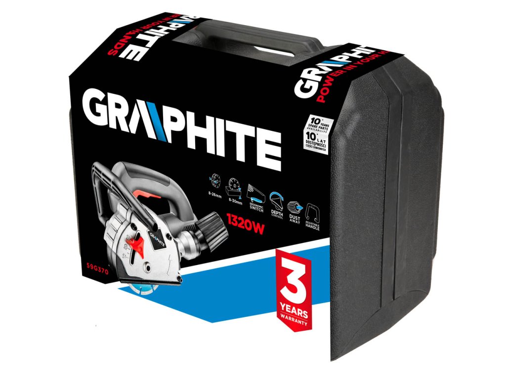 Vysoko kvalitná drážkovacia frézka GRAPHITE s výkonom 1320 W je určená na vytváranie drážok pre káble. Zariadenie má ergonomický tvar, protišmykovú podložku na hlavnej rukoväti a tvarovanú dodatočnú rukoväť. Drážkovacia frézka má nastaviteľnú hĺbku rezu v rozmedzí od 8 do 30 mm a šírku od 8 mm do 26 mm. Maximálna rýchlosť otáčok zariadenia je 9000 otáčok za minútu. Prístroj má tepelnú ochranu proti preťaženiu a blokádu proti náhodnému spusteniu. Nástroj je tiež vybavený blokádou vretena, ktorý umožňuje výmenu kotúčov. Drážkovacia frézka má systém odsávania prachu, čo uľahčuje prácu najmä vo vnútri budov. Zariadenie je vybavené pružným a odolným napájacím káblom v gumovom obale s dĺžkou 2 m, ktorý je tiež určený na profesionálne a priemyselné použitie tak v interiéri, ako aj v exteriéri. V sade sú aj: montážne kľúče, adaptér, distančné podložky a dláto. Súlad s európskymi bezpečnostnými normami potvrdzuje certifikát CE.