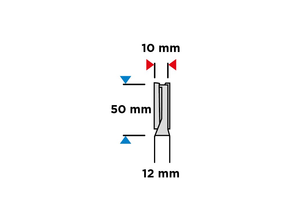 Dvojdrážková dlhá fréza, wolfrám-karbidová doska (HM), priemer 10 mm, pracovná výška 50 mm, priemer stopky 12 mm, na drevo, PVC, drevotrieskové dosky, dve čepele