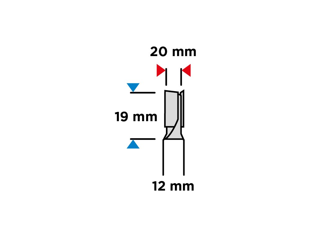 Dvojbritvová prstová fréza, karbid volfrámu (HM), priemer 20 mm, pracovná výška 19 mm, priemer stopky 12 mm, na drevo, PVC, drevotrieskové dosky, dve čepele