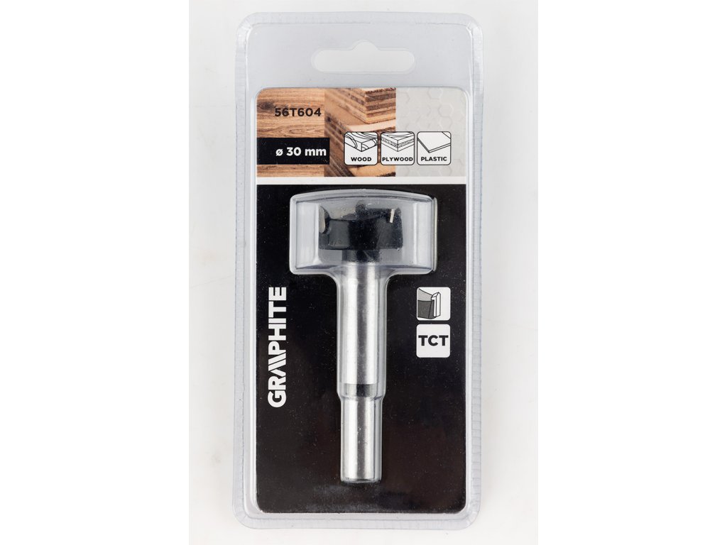 30 mm široká fréza GRAPHITE 56T604 je určená na vŕtanie otvorov do dreva, nábytkových dosiek a plastov. Čepele s karbidovými hrotmi (TCT) poskytujú odolnosť a presnú povrchovú úpravu. Konštrukcia nástroja umožňuje vytvárať otvory s plochým dnom a samostrediaci hrot umožňuje presné umiestnenie v materiáli. Fréza GRAPHITE má stredové a vonkajšie rezné čepele, celkovú dĺžku 85 mm a valcovú stopku.
