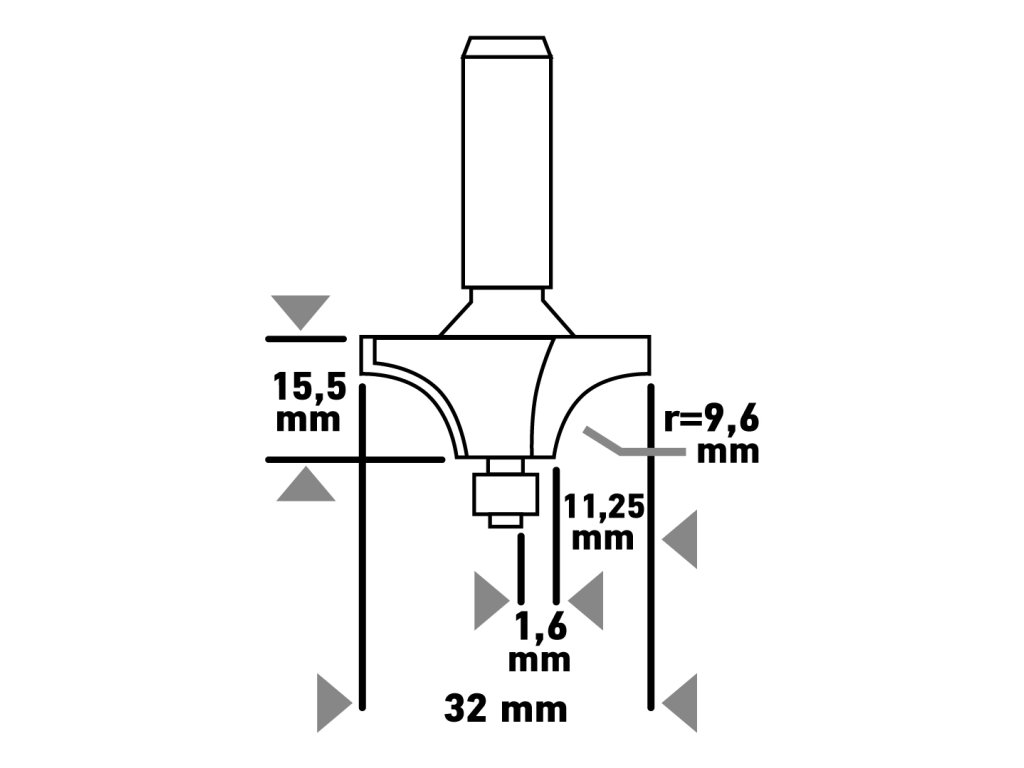 Fréza na drevo s ložiskom, obojstranná, čepeľ z karbidu volfrámu (TCT), priemer stopky 8 mm, priemer čepele 32 mm, výška čepele 15,5 mm, rádius 9,6 mm, celková dĺžka 57 mm, použitie na drevo, zaoblenie
