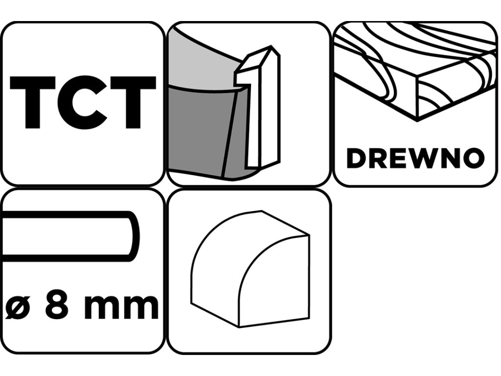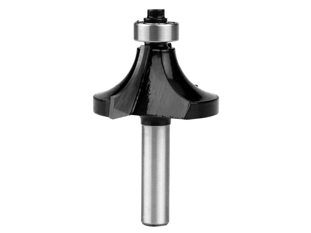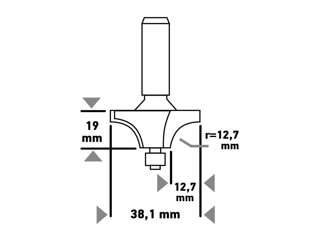 Fréza na drevo s ložiskom, obojstranná, čepeľ z karbidu volfrámu (TCT), priemer stopky 8 mm, priemer čepele 38,1 mm, výška čepele 19 mm, rádius 12,7 mm, celková dĺžka 60 mm, použitie na drevo, zaoblenie