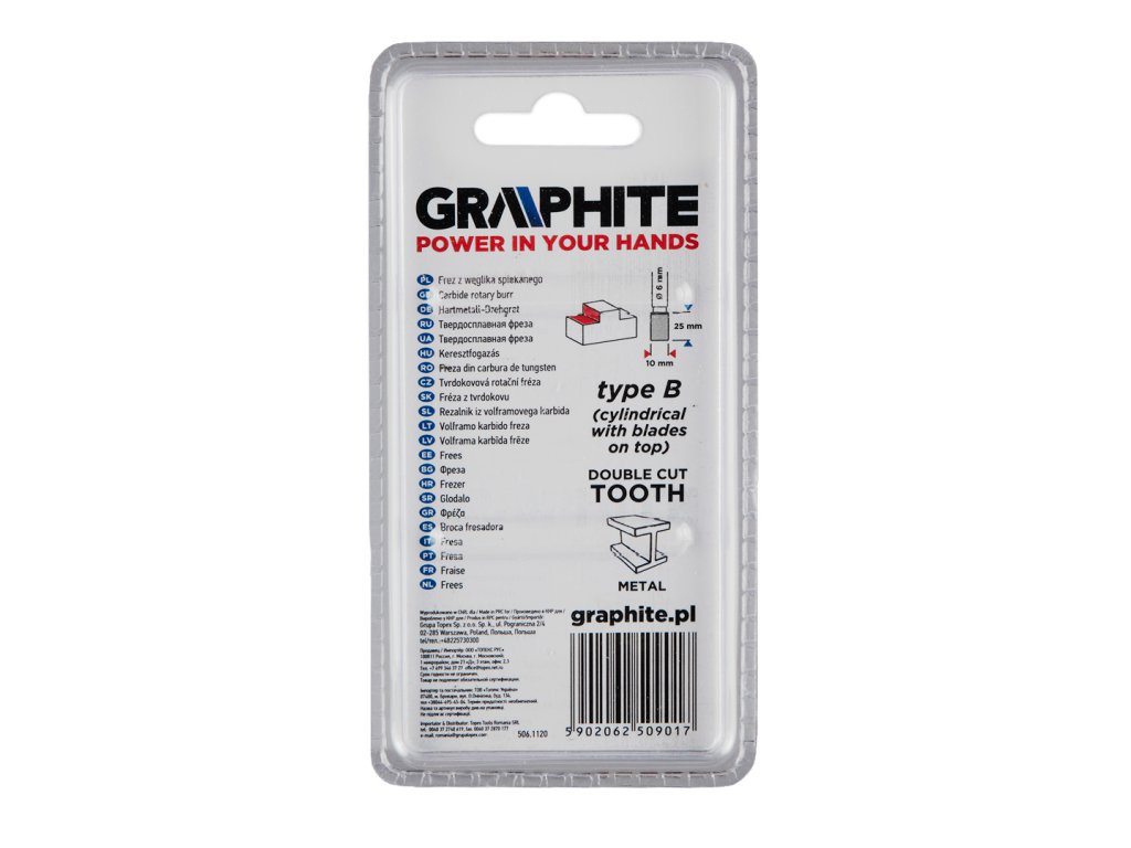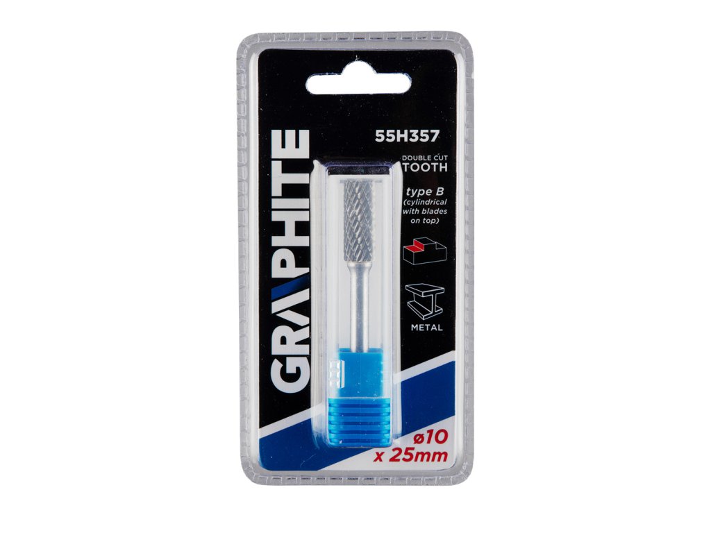 Fréza na kov GRAPHITE (ref. 55H357) typ B (valcová s čepeľami na vrchu) s rozmermi 10 x 25 mm je priamy brúsny nástroj na rezanie alebo pilovanie povrchov obrobkov. Je určený na prácu s materiálmi, ako sú kovy, hliník a plasty. Použitie spekaného karbidu dodáva nástroju vysokú tvrdosť a odolnosť voči abrazívnemu opotrebovaniu. Fréza je vybavená dvojitým rezaním na jednoduché odstraňovanie triesky z obrobku.