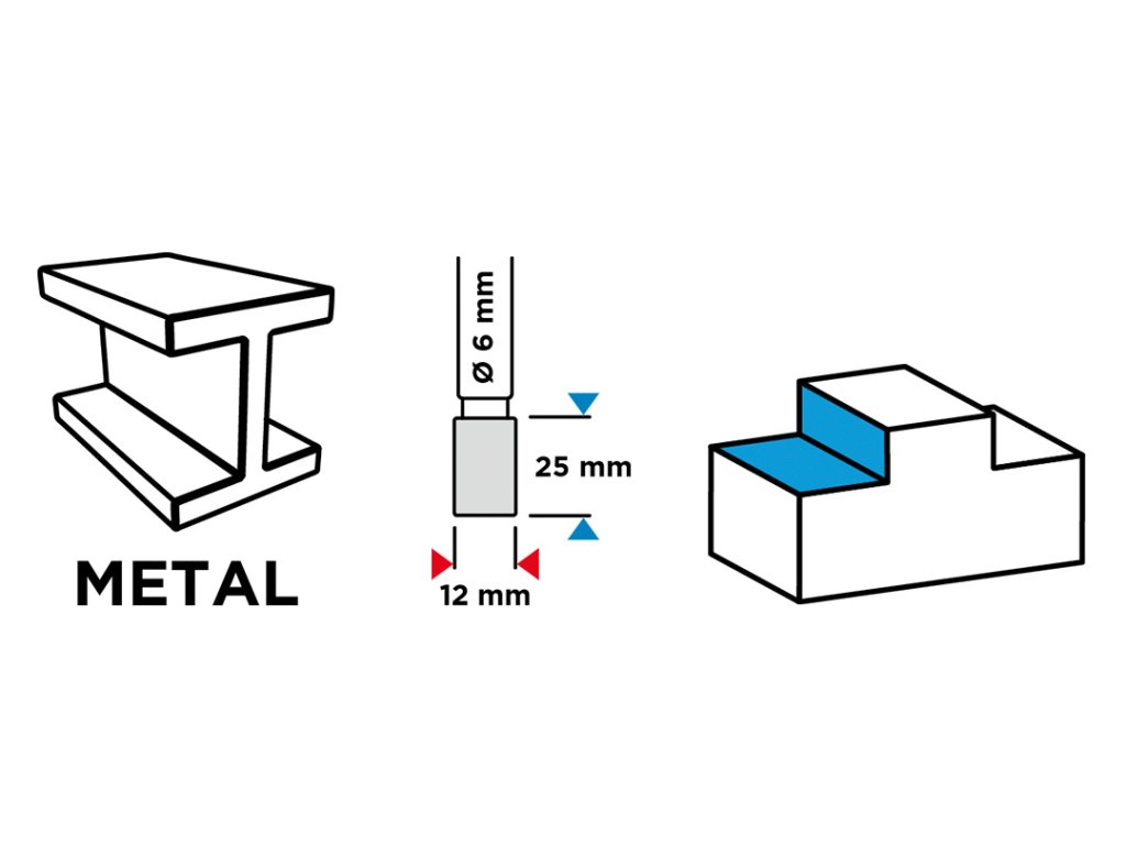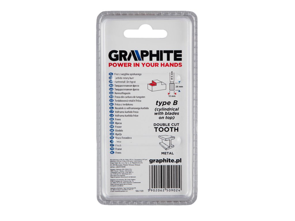 Fréza na kov GRAPHITE (ref. 55H358) typ B (valcová s čepeľami na vrchu) s rozmermi 12 x 25 mm je priamy brúsny nástroj na rezanie alebo pilovanie povrchov obrobkov. Je určený na prácu s materiálmi, ako sú kovy, hliník a plasty. Použitie spekaného karbidu dodáva nástroju vysokú tvrdosť a odolnosť voči abrazívnemu opotrebovaniu. Fréza je vybavená dvojitým rezaním, ktoré umožňuje ľahké odstraňovanie triesky z obrobku.