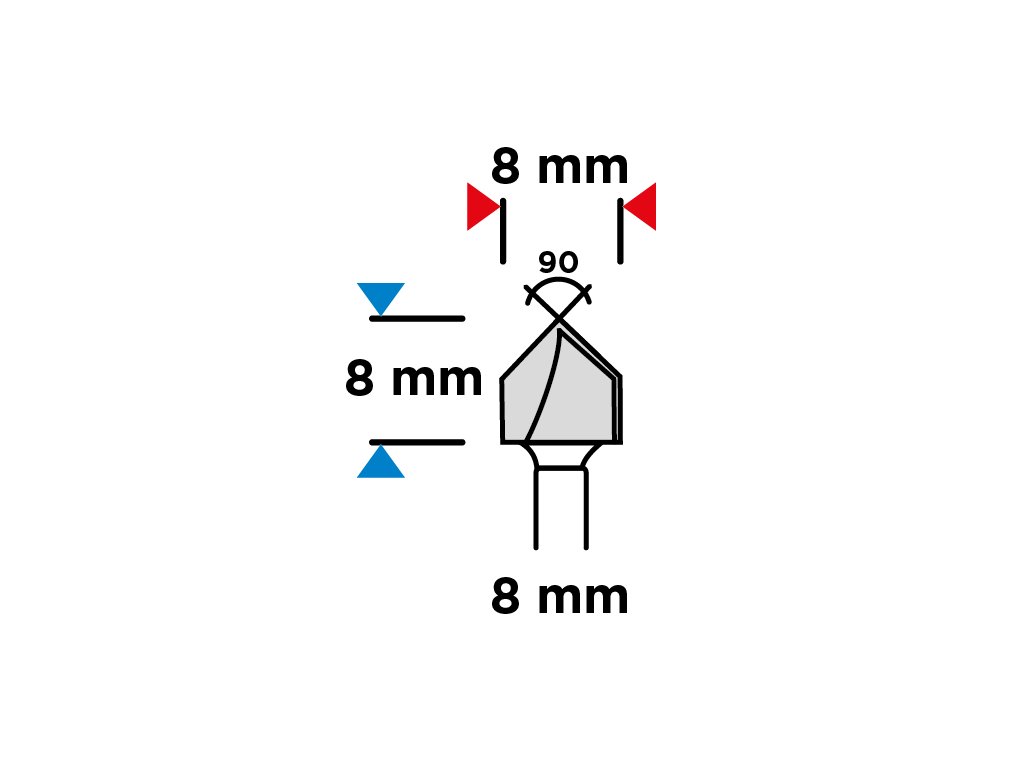 Fréza s V-drážkou, wolfrám-karbidová doštička (HM), pracovný priemer frézy 8 mm, priemer stopky 8 mm, pracovná dĺžka frézy 8 mm, na drevo, drevotriesku, MDF, preglejku