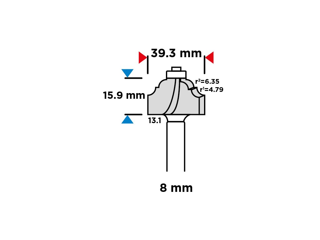 Čelná fréza s ozdobným ložiskom, tvrdokovová doštička, priemer vyvrtávania 39.3 mm, pracovná dĺžka frézy 15,9 mm, priemer stopky 8 mm, na drevo