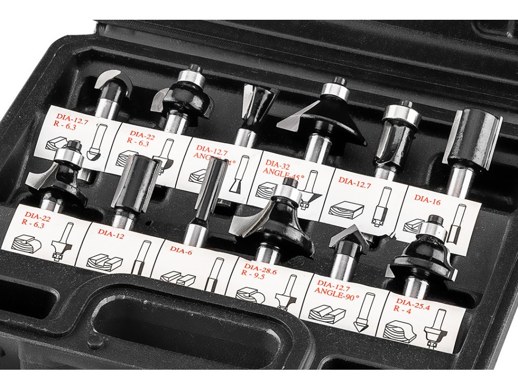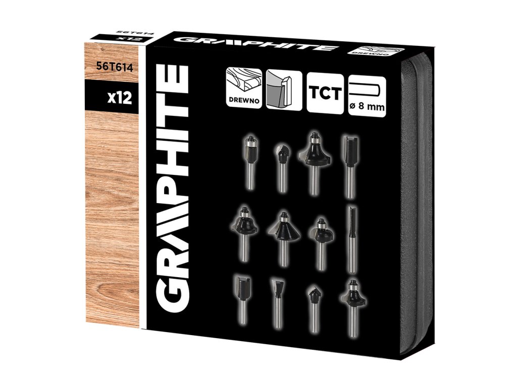 Frézy do dreva Pitchfork, stopka 8 mm, sada 12 ks. 56T614 od spoločnosti GRAPHITE je sada vidlicových fréz so stopkou 8 mm, ktorá pozostáva z 12 kusov rôznych tvarov a veľkostí na obrábanie dreva. Čepele sú vyrobené z karbidu volfrámu, ktorý zaručuje odolnosť a presnosť rezania príslušenstva. Frézy GRAPHITE sú vhodné na použitie s frézami a umožňujú rezanie hrán, drážok a vytváranie ozdobných profilov. Súprava obsahuje frézy s priemerom od 6 mm do 31,8 mm a rôznymi uhlami a polomermi rezu. Každá fréza je vybavená odnímateľným ložiskom na jednoduchú obsluhu a údržbu.