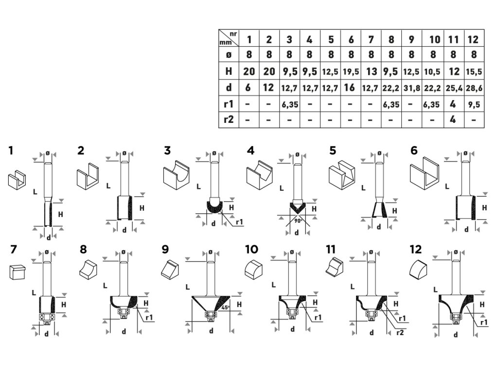 Frézy do dreva WIDIA, stopka 8 mm, sada 12 ks.