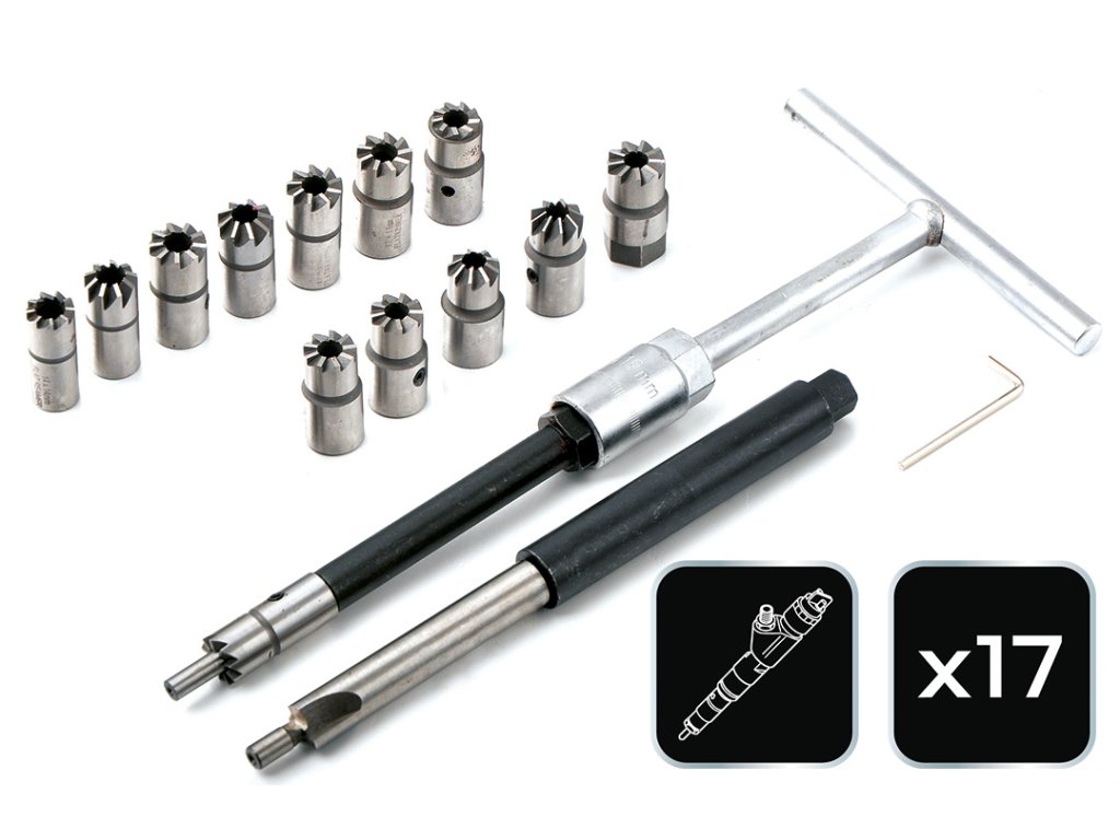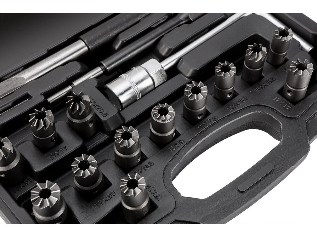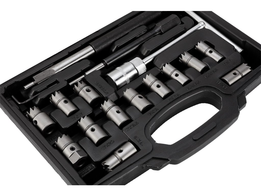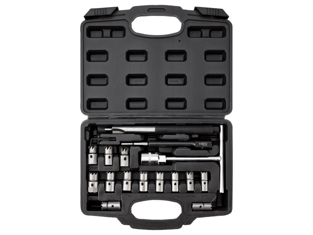Frézy na čistenie vstrekovacích zásuviek - sada 17 ks. NEO určený na odstraňovanie usadenín zo zásuviek vstrekovačov. Tým sa uľahčí montáž vstrekovača do zásuvky. Určené pre väčšinu osobných automobilov. Sada je balená v kufríku.