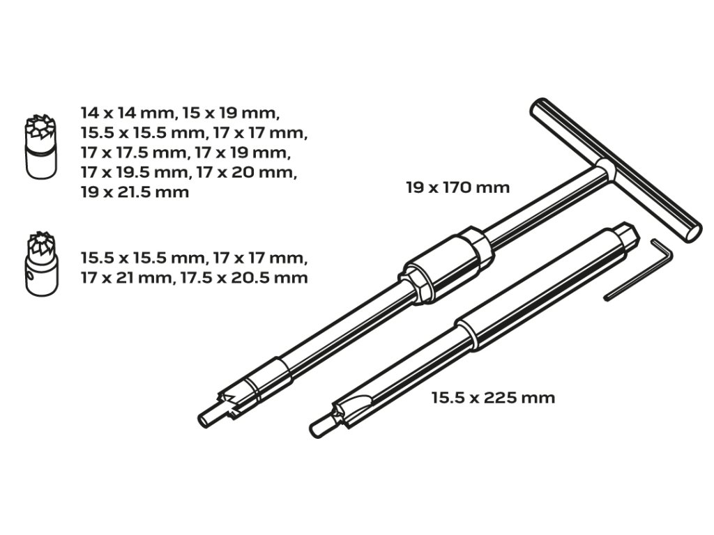 Sada obsahuje: ploché výstružníky - 14 x 14 mm, 15 x 19 mm, 15,5 x 15,5 mm, 17 x 17 mm, 17 x 17,5 mm, 17 x 19 mm, 17 x 19 mm, 17 x 19.5 mm, 17 x 20 mm, 19 x 21,5 mm uhlové výstružníky - 15,5 x 15,5 mm, 17 x 17 mm, 17 x 21 mm, 17,5 x 21,5 mm; pilotný vrták 19 x 170 mm fréza 15,5 x 225 mm šesťhranný kľúč 2,5 mm T-drážková matica