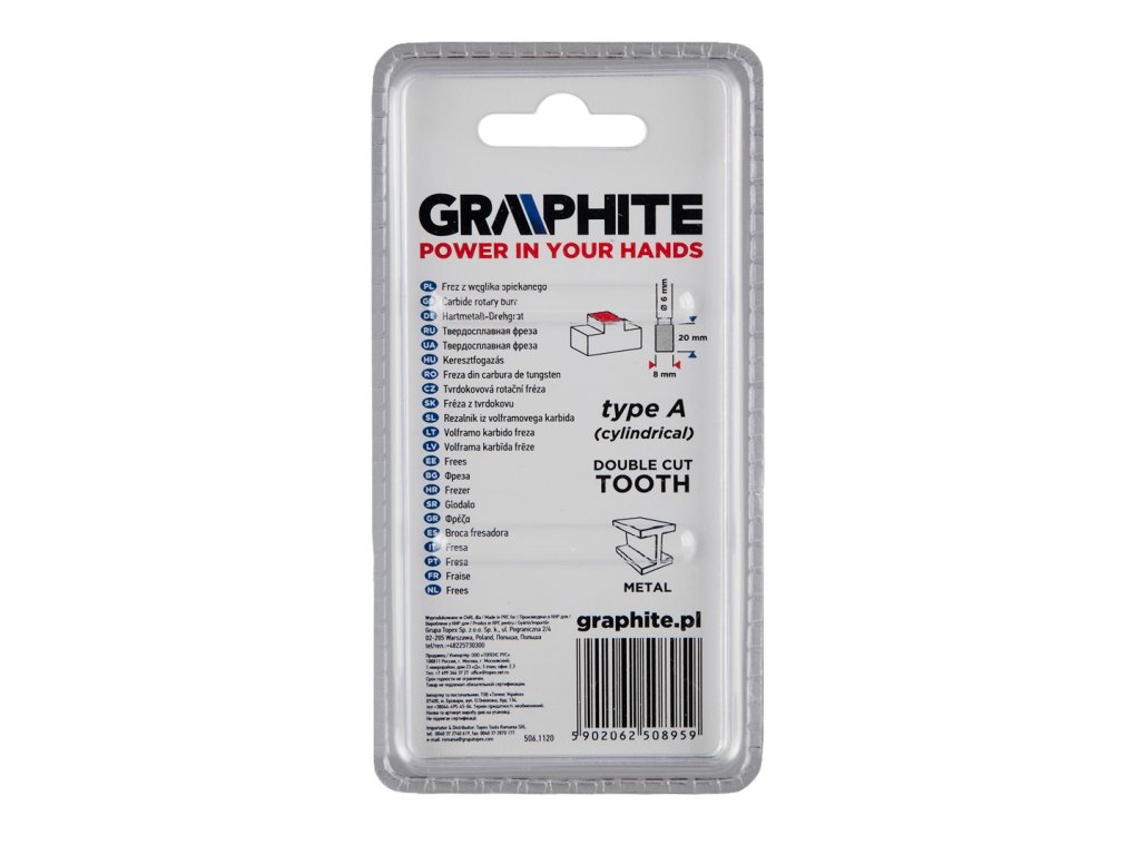 Vrták do kovu GRAPHITE (ref. 55H351), typ A (valcový) a rozmer 8 x 20 mm je priamy brúsny nástroj na rezanie alebo pilovanie povrchov obrobkov. Je určený na prácu s materiálmi, ako sú kovy, hliník a plasty. Použitie spekaného karbidu dodáva nástroju vysokú tvrdosť a odolnosť voči abrazívnemu opotrebovaniu. Fréza je vybavená dvojitým rezaním na ľahké odstraňovanie triesky z obrobku.