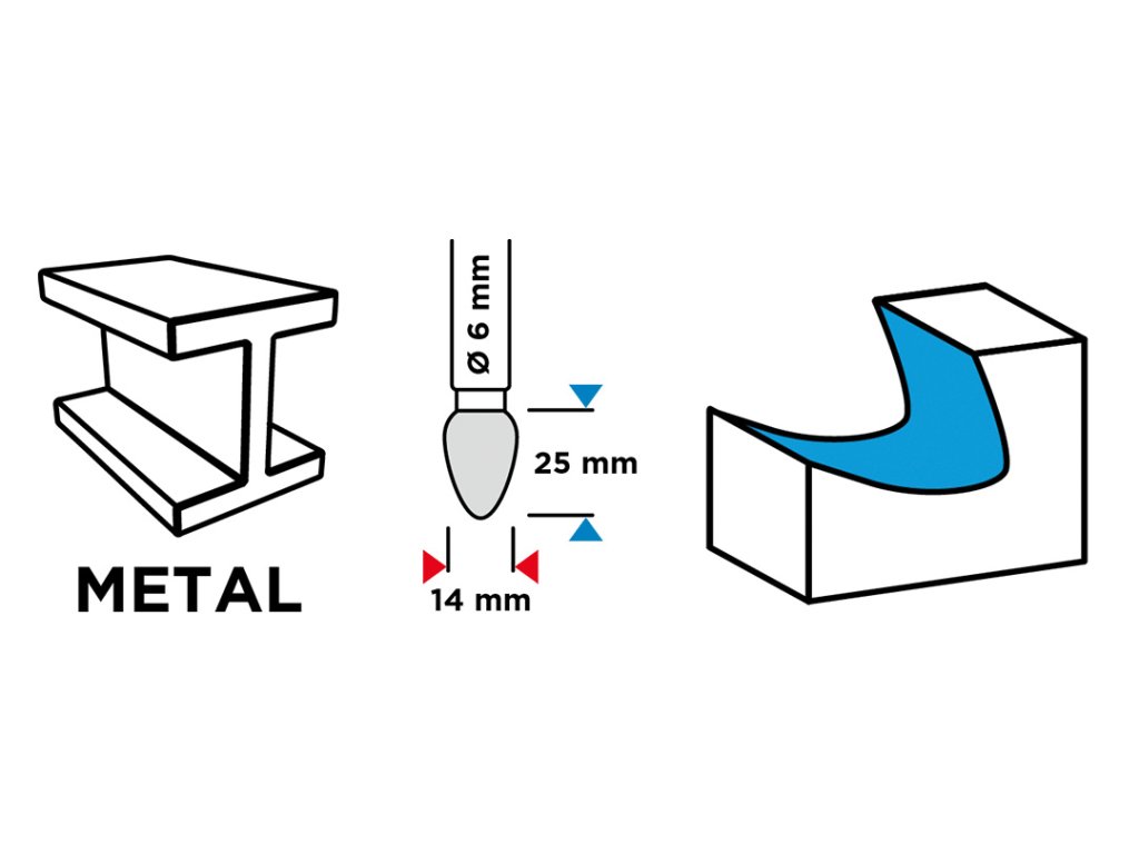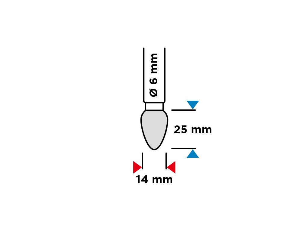 Kovová čelná fréza, typ F - špicatá guľatá špička (F 1425), karbid, priemer 14 mm, dvojitý rez, pracovná dĺžka 25 mm, stopka 6 x 45 mm, pre priame brúsky.