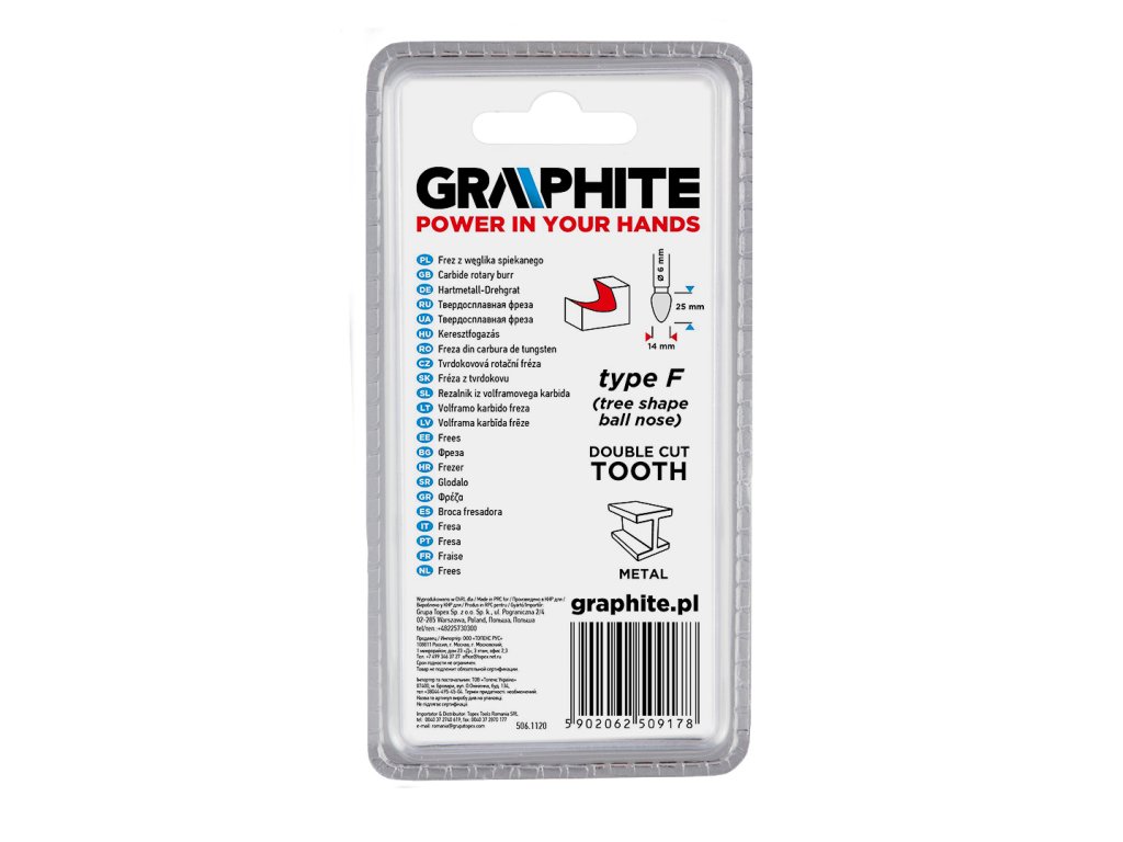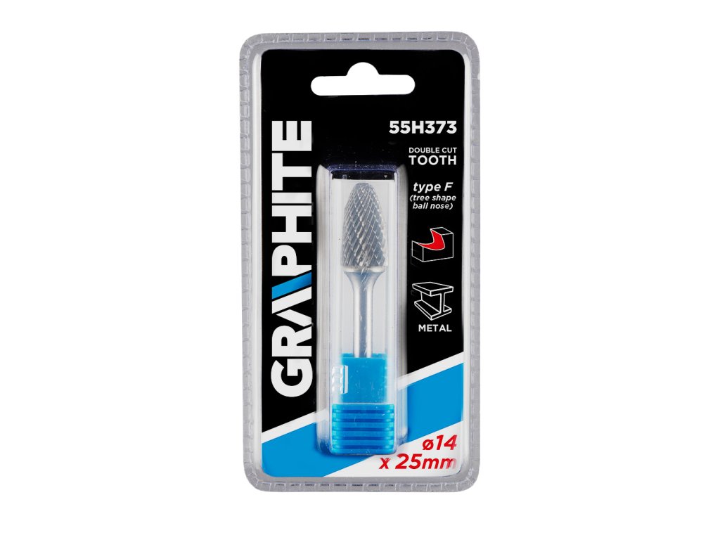 Fréza na kov GRAPHITE (ref. 55H373) typ F (špicatá zaoblená) s rozmermi 14 x 25 mm je priamy brúsny nástroj na rezanie alebo pilovanie povrchov obrobkov. Je určený na prácu s materiálmi, ako sú kovy, hliník a plasty. Použitie spekaného karbidu dodáva nástroju vysokú tvrdosť a odolnosť voči abrazívnemu opotrebovaniu. Fréza je vybavená dvojitým rezaním, ktoré umožňuje ľahké odstraňovanie triesky z obrobku.