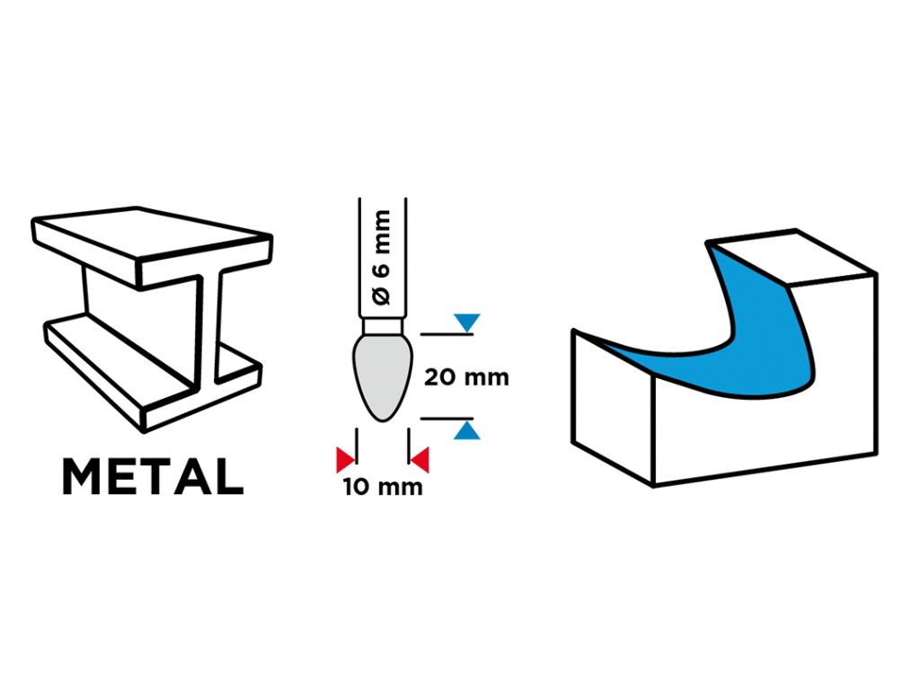 Kovová čelná fréza, typ F - špicatý okrúhly hrot (F 1020), karbid, priemer 10 mm, dvojitý rez, pracovná dĺžka 20 mm, stopka 6 x 45 mm, pre priame brúsky.
