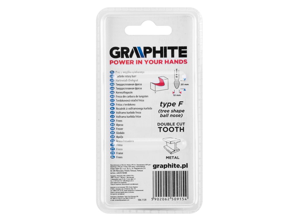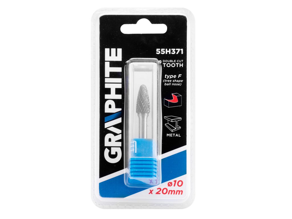 Fréza na kov GRAPHITE (ref. 55H371) typ F (špicatá zaoblená) s rozmermi 10 x 20 mm je priamy brúsny nástroj na rezanie alebo pilovanie povrchov obrobkov. Je určený na prácu s materiálmi, ako sú kovy, hliník a plasty. Použitie spekaného karbidu dodáva nástroju vysokú tvrdosť a odolnosť voči abrazívnemu opotrebovaniu. Fréza je vybavená dvojitým rezaním, ktoré umožňuje ľahké odstraňovanie triesky z obrobku.