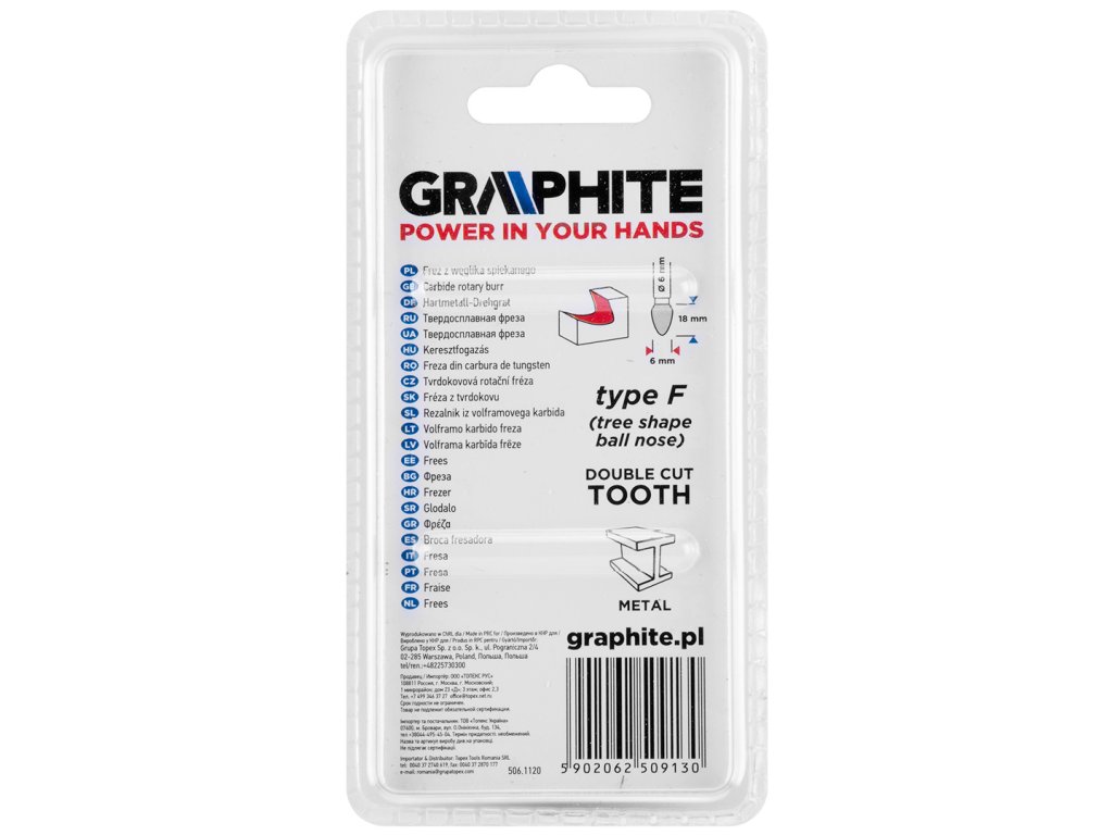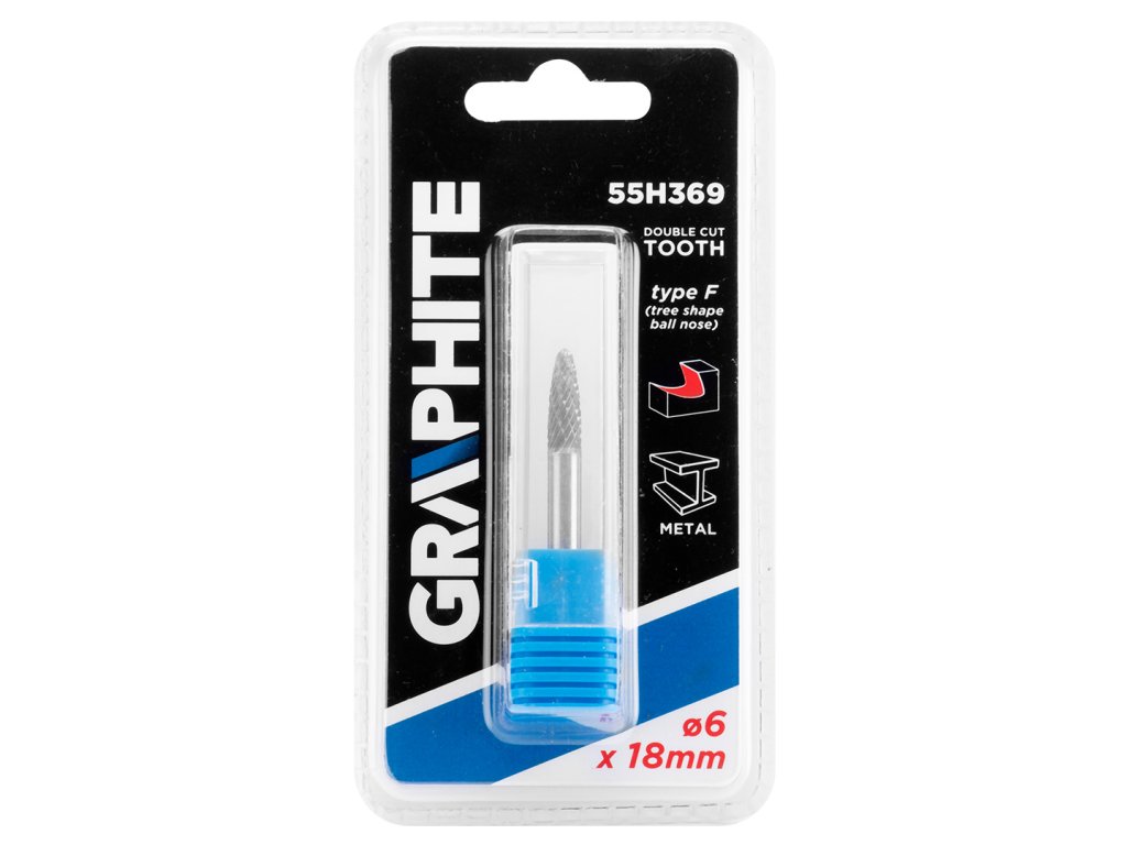 Fréza na kov GRAPHITE (ref. 55H369) typ F (špicatá zaoblená) s rozmermi 6 x 18 mm je priamy brúsny nástroj na rezanie alebo pilovanie povrchov obrobkov. Je určený na prácu s materiálmi, ako sú kovy, hliník a plasty. Použitie spekaného karbidu dodáva nástroju vysokú tvrdosť a odolnosť voči abrazívnemu opotrebovaniu. Fréza je vybavená dvojitým rezaním na jednoduché odstraňovanie triesky z obrobku.