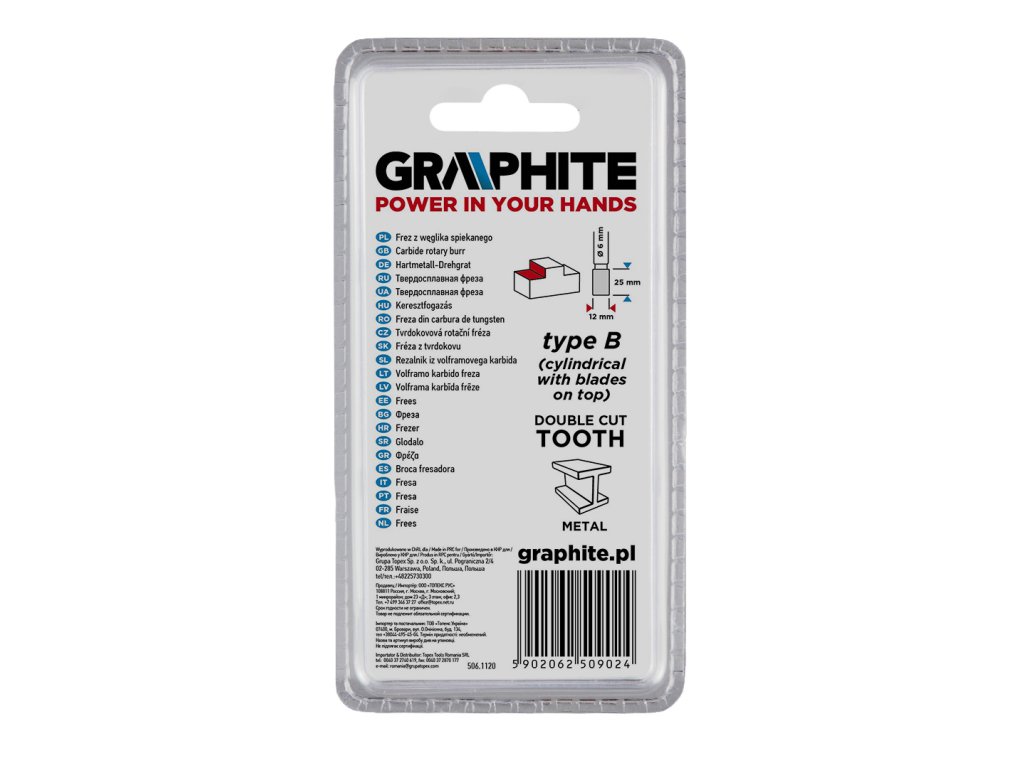 Fréza na kov GRAPHITE (ref. 55H359) typ B (valcová s čepeľami na vrchu) s rozmermi 16 x 25 mm je priamy brúsny nástroj na rezanie alebo pilovanie povrchov obrobkov. Je určený na prácu s materiálmi, ako sú kovy, hliník a plasty. Použitie spekaného karbidu dodáva nástroju vysokú tvrdosť a odolnosť voči abrazívnemu opotrebovaniu. Fréza je vybavená dvojitým rezaním, ktoré umožňuje ľahké odstraňovanie triesok z obrobku.