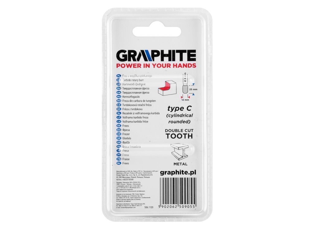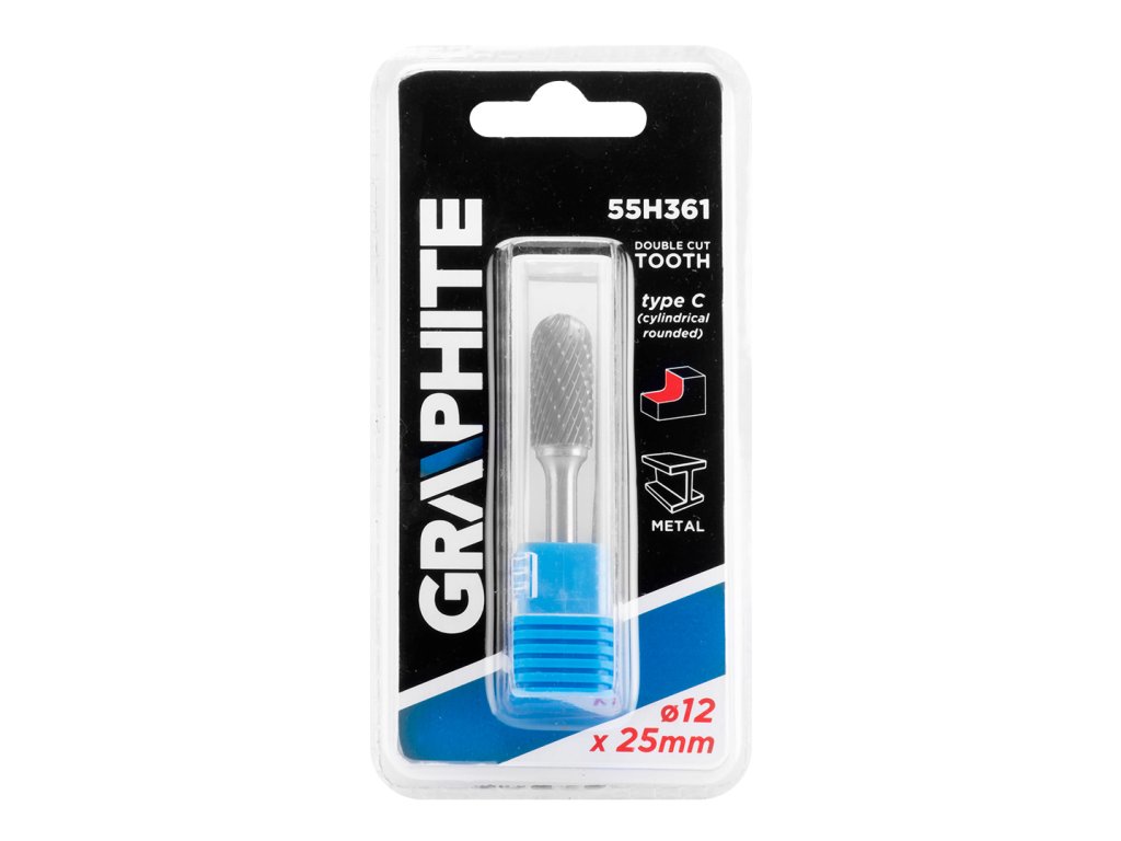 Fréza na kov GRAPHITE (ref. 55H361) typ C (zaoblený valec) s rozmermi 12 x 25 mm je priamy brúsny nástroj na rezanie alebo pilovanie povrchov obrobkov. Je určený na prácu s materiálmi, ako sú kovy, hliník a plasty. Použitie spekaného karbidu dodáva nástroju vysokú tvrdosť a odolnosť voči abrazívnemu opotrebovaniu. Fréza je vybavená dvojitým rezaním, ktoré umožňuje ľahké odstraňovanie triesky z obrobku.