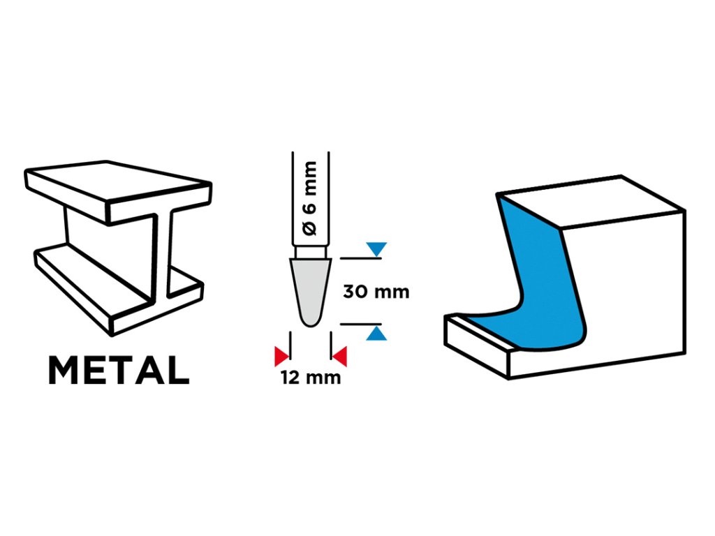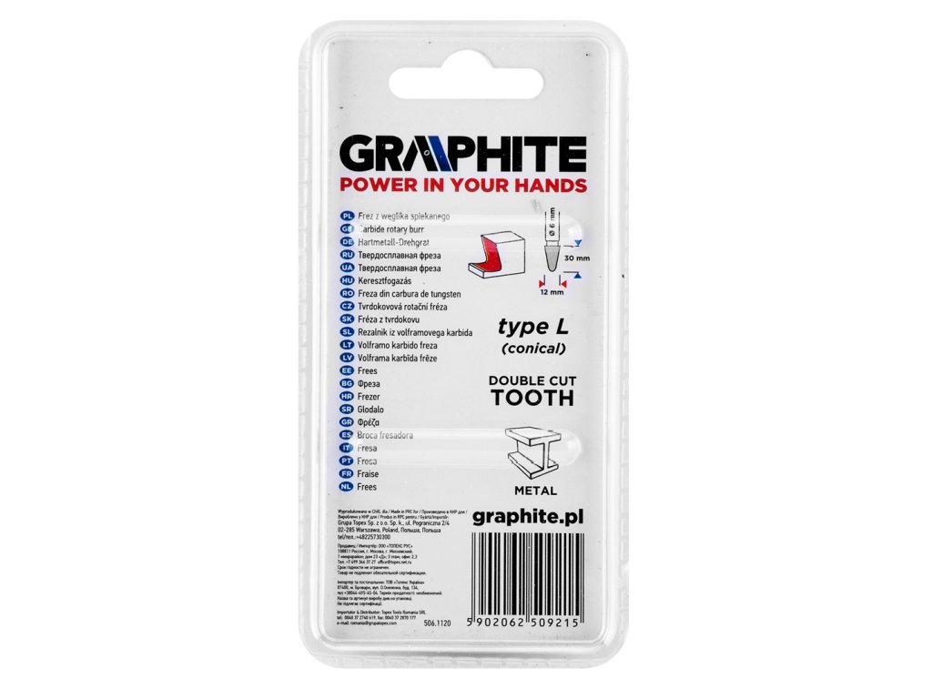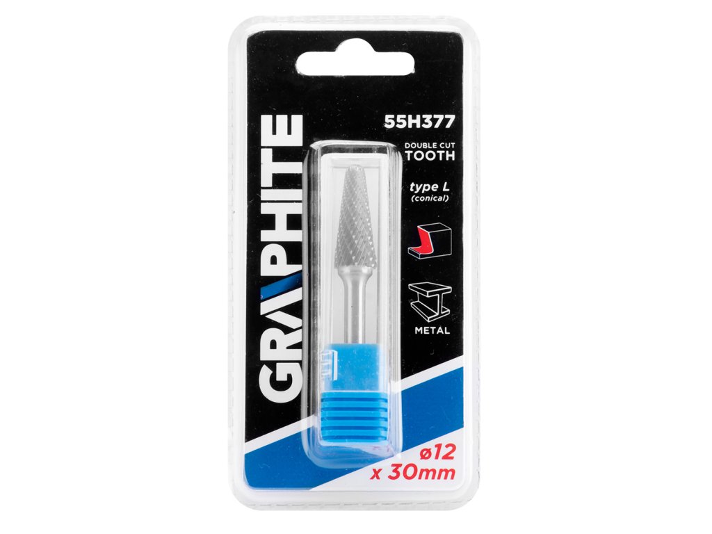 Fréza na kov GRAPHITE (ref. 55H377) Typ L (kužeľová) s rozmermi 12 x 30 mm je priamy brúsny nástroj na rezanie alebo pilovanie povrchov obrobkov. Je určený na prácu s materiálmi, ako sú kovy, hliník a plasty. Použitie spekaného karbidu dodáva nástroju vysokú tvrdosť a odolnosť voči abrazívnemu opotrebovaniu. Fréza sa vyznačuje dvojitým rezaním, ktoré umožňuje jednoduché odstránenie prebrúsenia v obrobku.