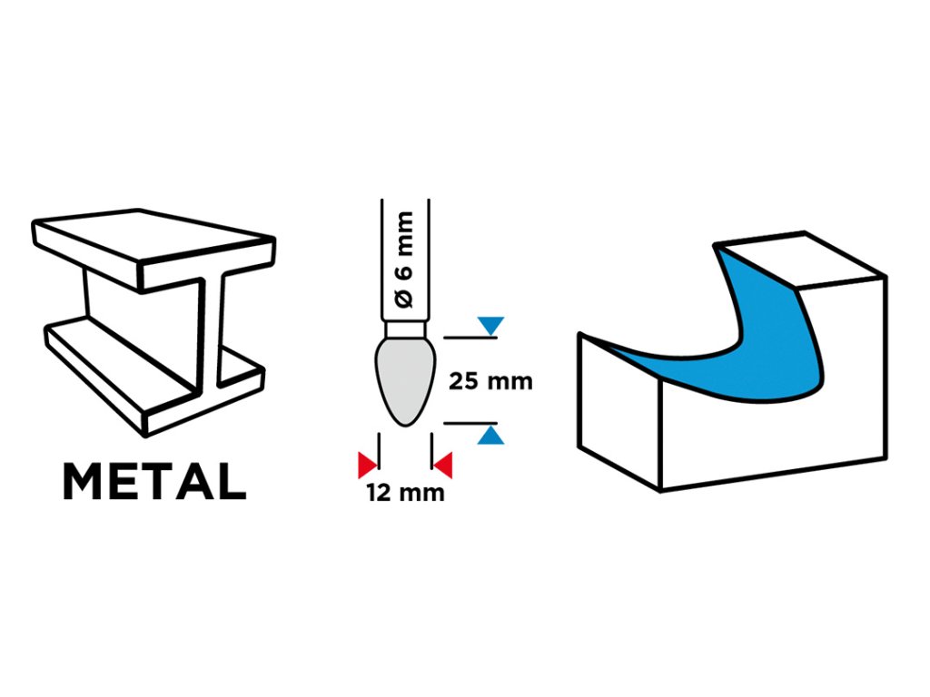Kovová čelná fréza, typ F - špicatý okrúhly hrot (F 1225), karbid, priemer 12 mm, dvojitý rez, pracovná dĺžka 25 mm, stopka 6 x 45 mm, pre priame brúsky.