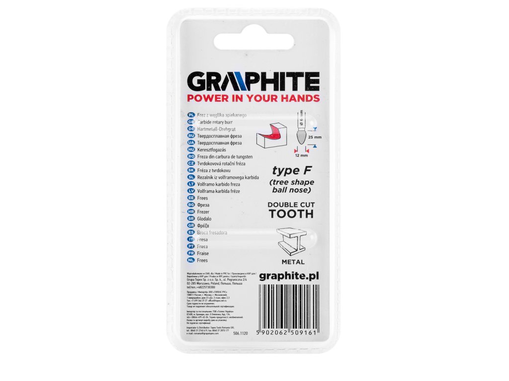 Fréza na kov GRAPHITE (ref. 55H372) typ F (špicatá zaoblená) s rozmermi 12 x 25 mm je priamy brúsny nástroj na rezanie alebo pilovanie povrchov obrobkov. Je určený na prácu s materiálmi, ako sú kovy, hliník a plasty. Použitie spekaného karbidu dodáva nástroju vysokú tvrdosť a odolnosť voči abrazívnemu opotrebovaniu. Fréza je vybavená dvojitým rezaním, ktoré umožňuje ľahké odstraňovanie triesky z obrobku.
