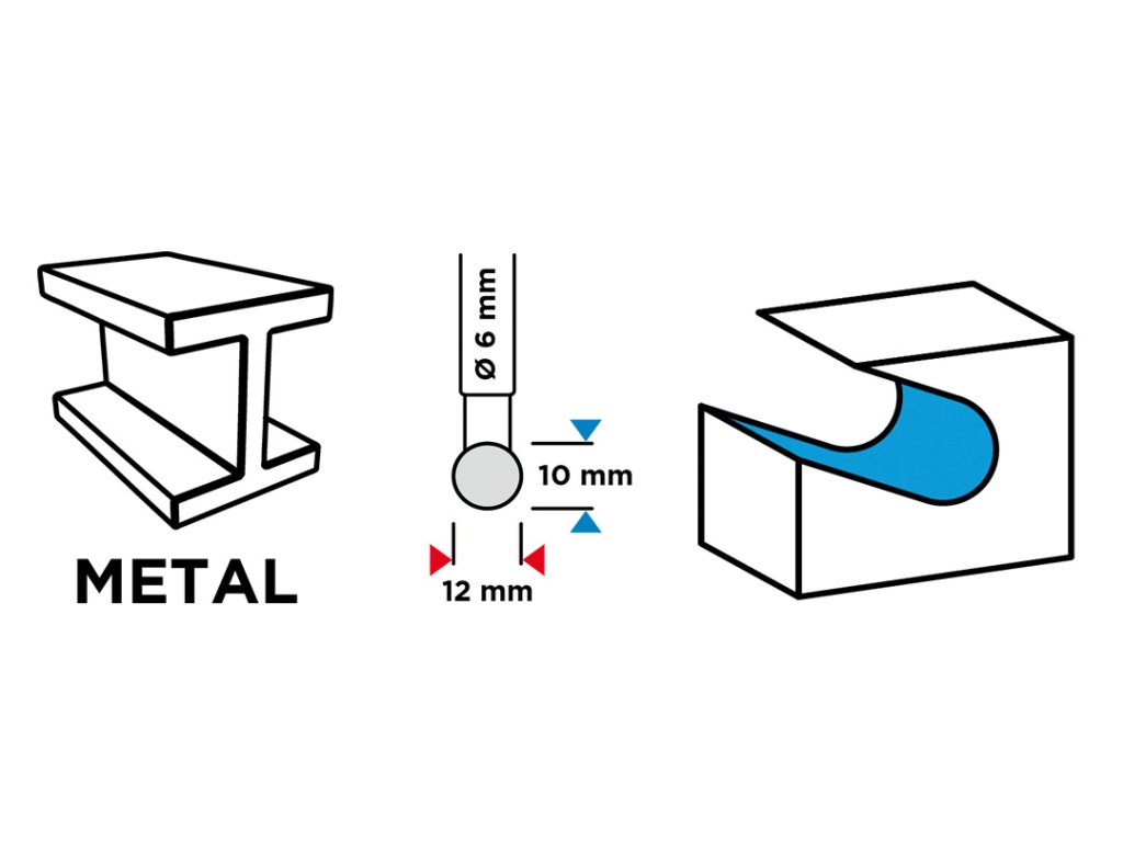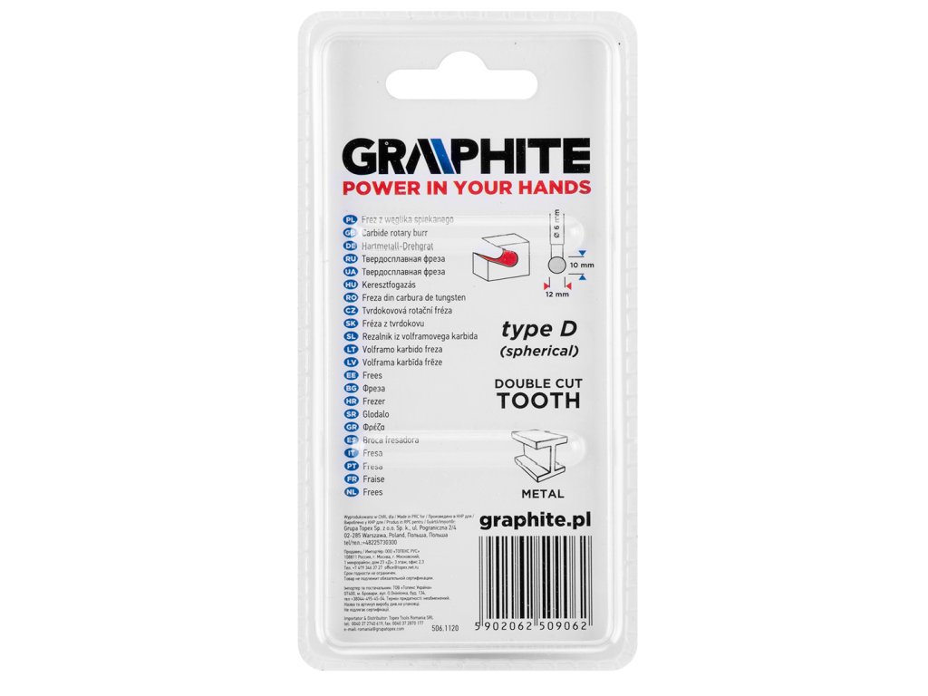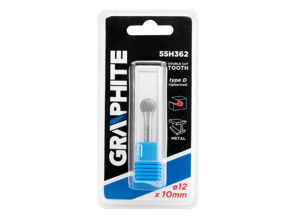 vrták do kovu GRAPHITE (ref. 55H362) typ D (guľový) s rozmermi 12 x 10 mm je priamy brúsny nástroj na rezanie alebo pilovanie povrchov obrobkov. Určené na prácu s materiálmi, ako sú kov, hliník a plasty. Použitie spekaného karbidu dodáva nástroju vysokú tvrdosť a odolnosť voči abrazívnemu opotrebovaniu. Fréza je vybavená dvojitým rezaním na ľahké odstraňovanie triesky z obrobku.
