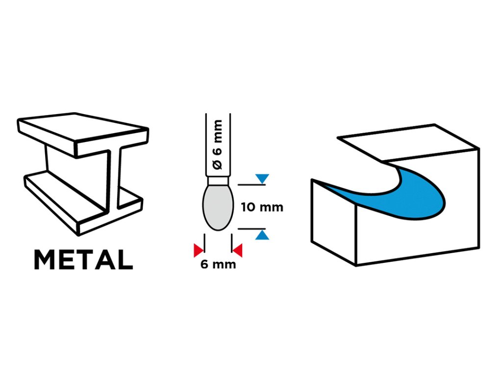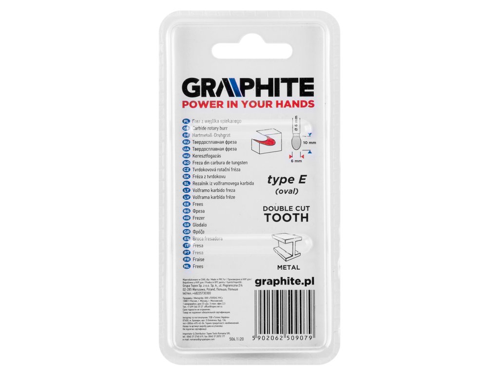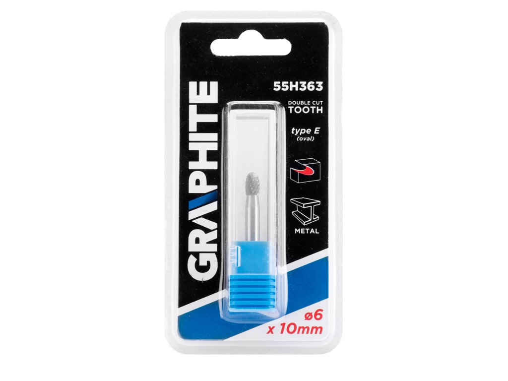 Fréza na kov GRAPHITE (ref. 55H363) typ E (oválna) s rozmermi 6 x 10 mm je priamy brúsny nástroj na rezanie alebo pilovanie povrchov obrobkov. Určené na prácu s materiálmi, ako sú kov, hliník a plasty. Použitie spekaného karbidu dodáva nástroju vysokú tvrdosť a odolnosť voči abrazívnemu opotrebovaniu. Fréza je vybavená dvojitým rezaním, ktoré umožňuje ľahké odstraňovanie triesky z obrobku.