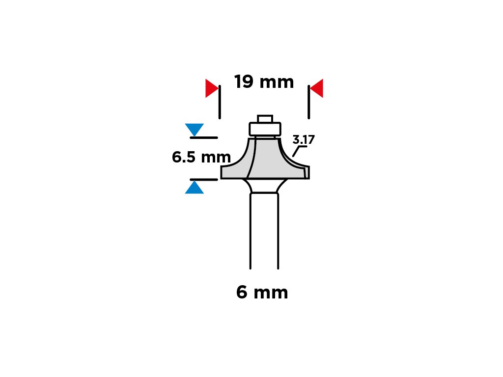 Fréza so zaobleným tvarom, plôška z karbidu volfrámu (HM), pracovný priemer frézy 19 mm, pracovná dĺžka frézy 6,5 mm, priemer stopky 6 mm, na drevo