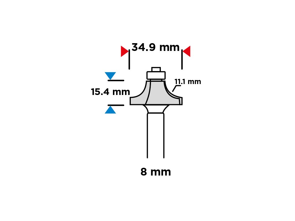 Fréza so zaobleným tvarom, plôška z karbidu volfrámu (HM), pracovný priemer frézy 34.9 mm, pracovná dĺžka frézy 15,4 mm, priemer stopky 8 mm, na drevo