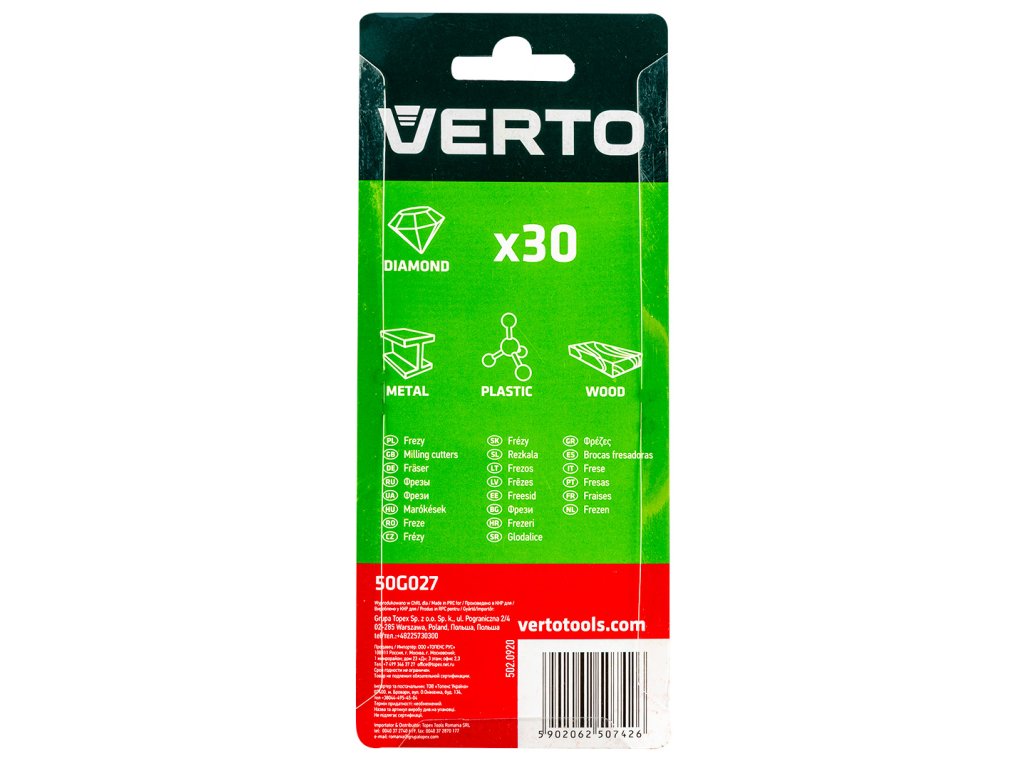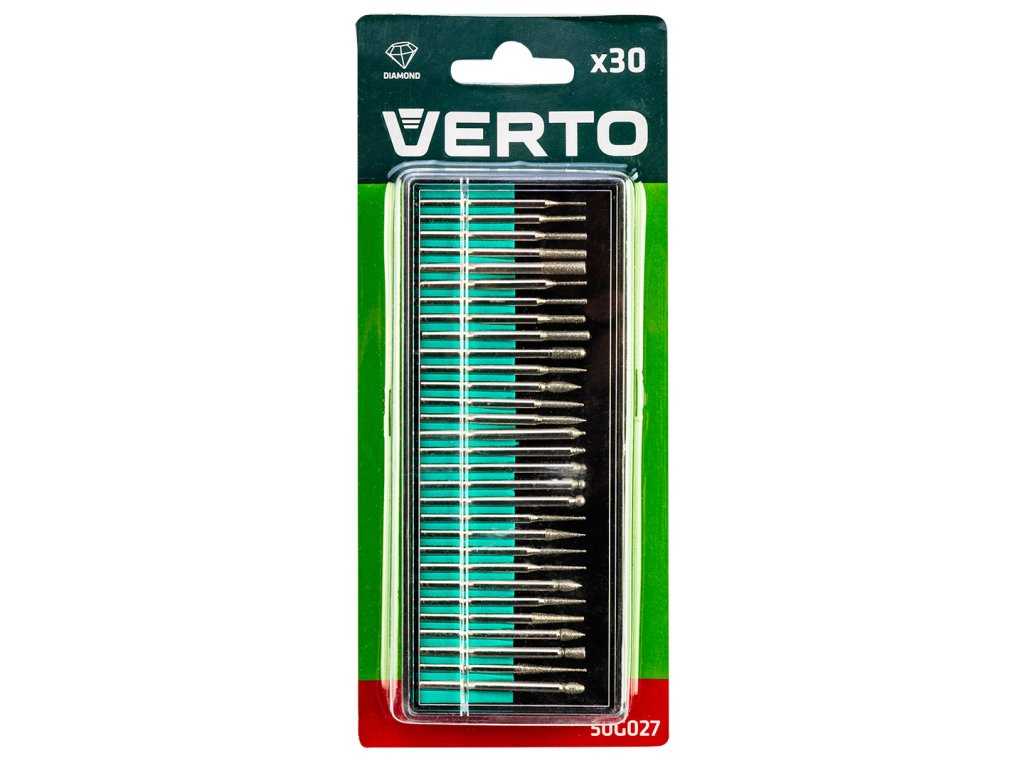 Príslušenstvo pre minibrúsku VERTO (ref. 50G027), sada 30 kusov. Obsahuje diamantové frézy rôznych typov. Sú vhodné na precízne práce v remeselníctve, modelárstve alebo autokozmetike. Možno ich použiť na: kov, odliatky, zvárané spoje, nity, odstraňovanie hrdze, keramiku, sklo, drevo, plasty. Pohodlné a kompaktné puzdro umožňuje jednoduché uloženie všetkých prvkov súpravy.