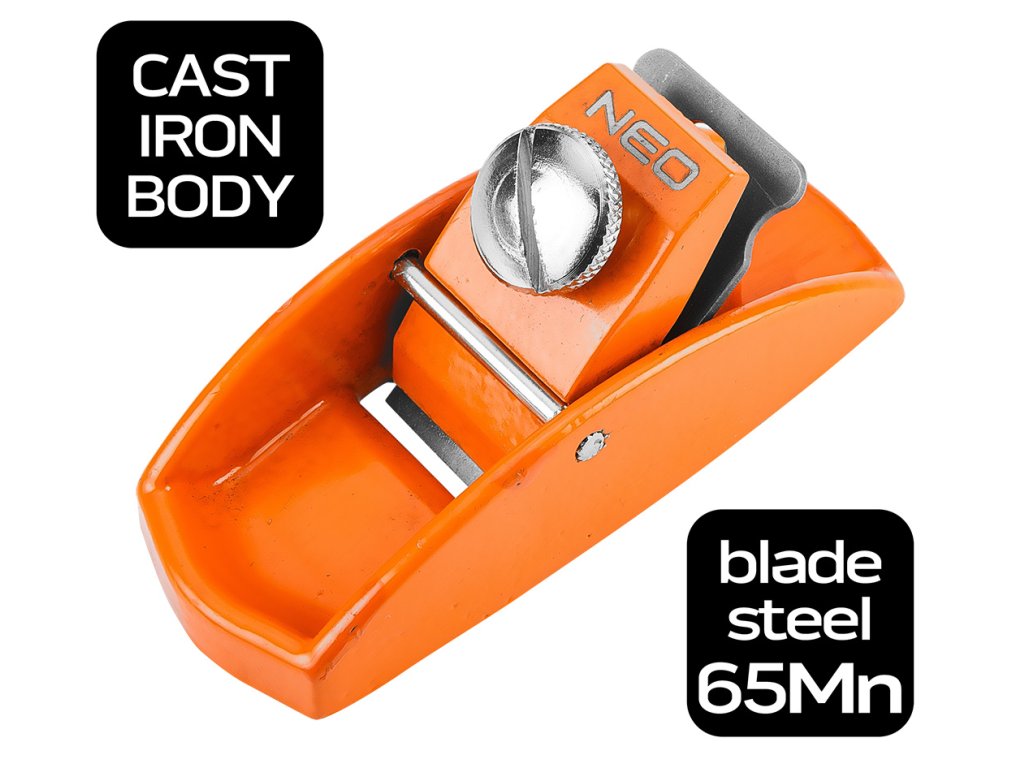 Kovový ručný hoblík na drevo 89 x 35 mm 41-350 od spoločnosti NEO TOOLS je mini model hoblíka určený na presné dokončovacie práce v dreve alebo niektorých plastoch. Má základnú dĺžku 89 mm, šírku 35 mm a šírku noža 26 mm. Telo hoblíka NEO TOOLS je vyrobené z masívnej liatiny a jeho nôž je vyrobený z ocele 65 MN. Prítlak čepele sa dosahuje pomocou prítlačnej skrutky. Ručný hoblík od značky NEO TOOLS sa odporúča predovšetkým na presné modelárske práce pre profesionálov a domácich majstrov.