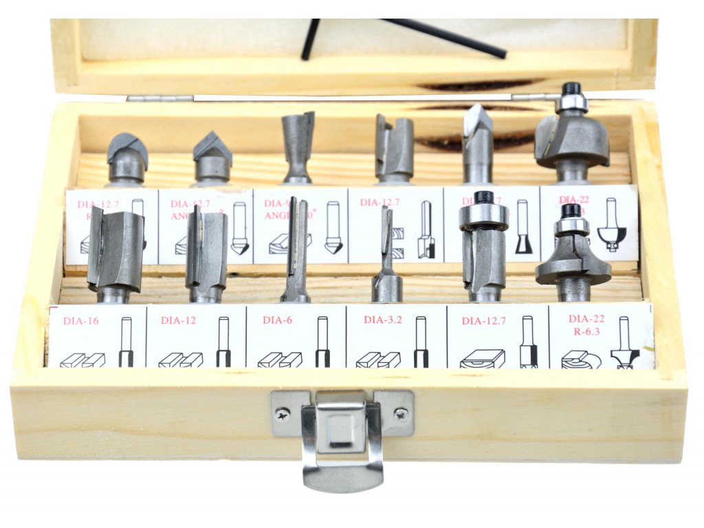 Sada obsahuje 12 kusov fréz na drevo vyrobených z ocele HSS.