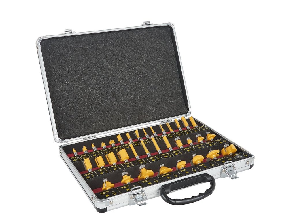 Sada 35 tvarových fréz s ložiskami na presné frézovanie hrán, profilov a drážok v dreve. Vhodné pre horné frézky.