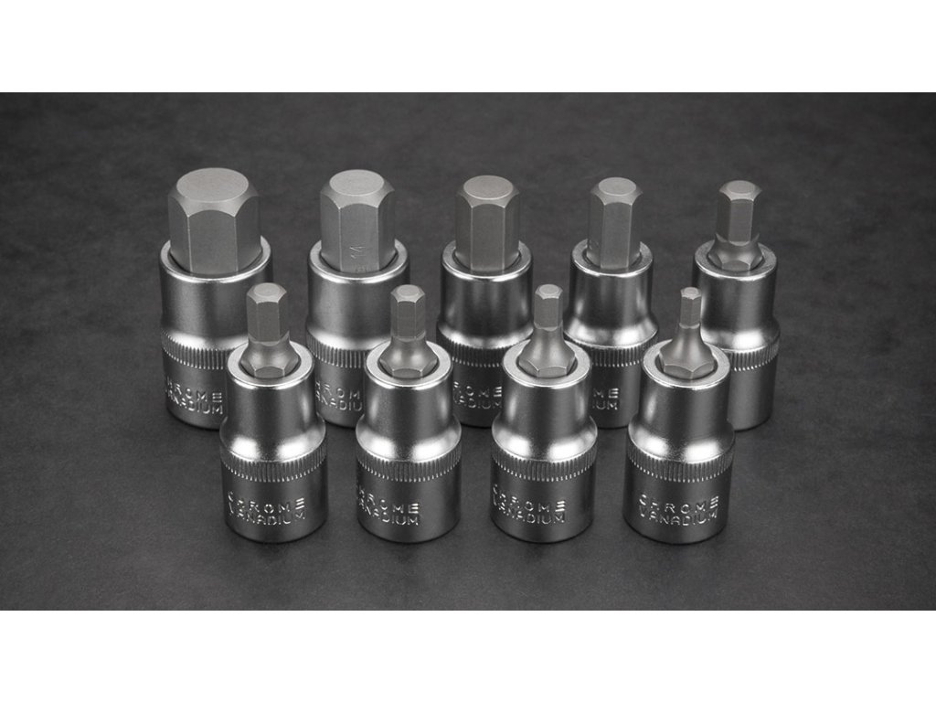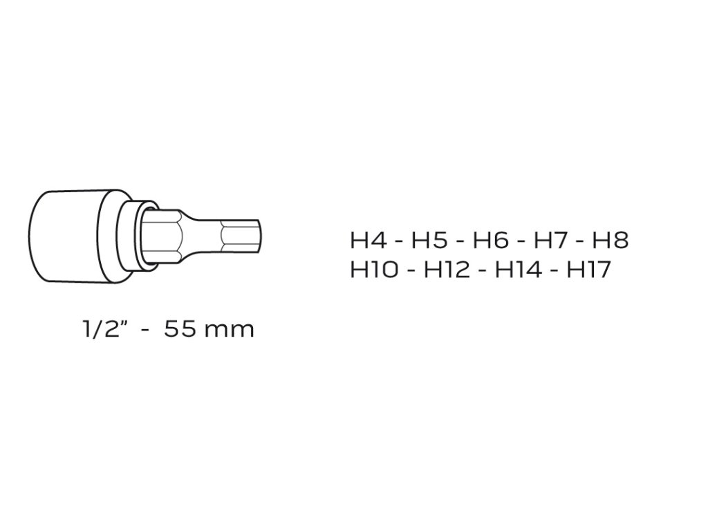 Šesťhranné bity na 55 mm nástrčné hlavice, sada 9 kusov, 1/2", CrV oceľová nástrčná hlavica, S2 oceľový hrot, veľkosti: H4, H5, H6, H7, H8, H10, H12, H14, H17, certifikát TÜV M+T, 25 rokov záruka