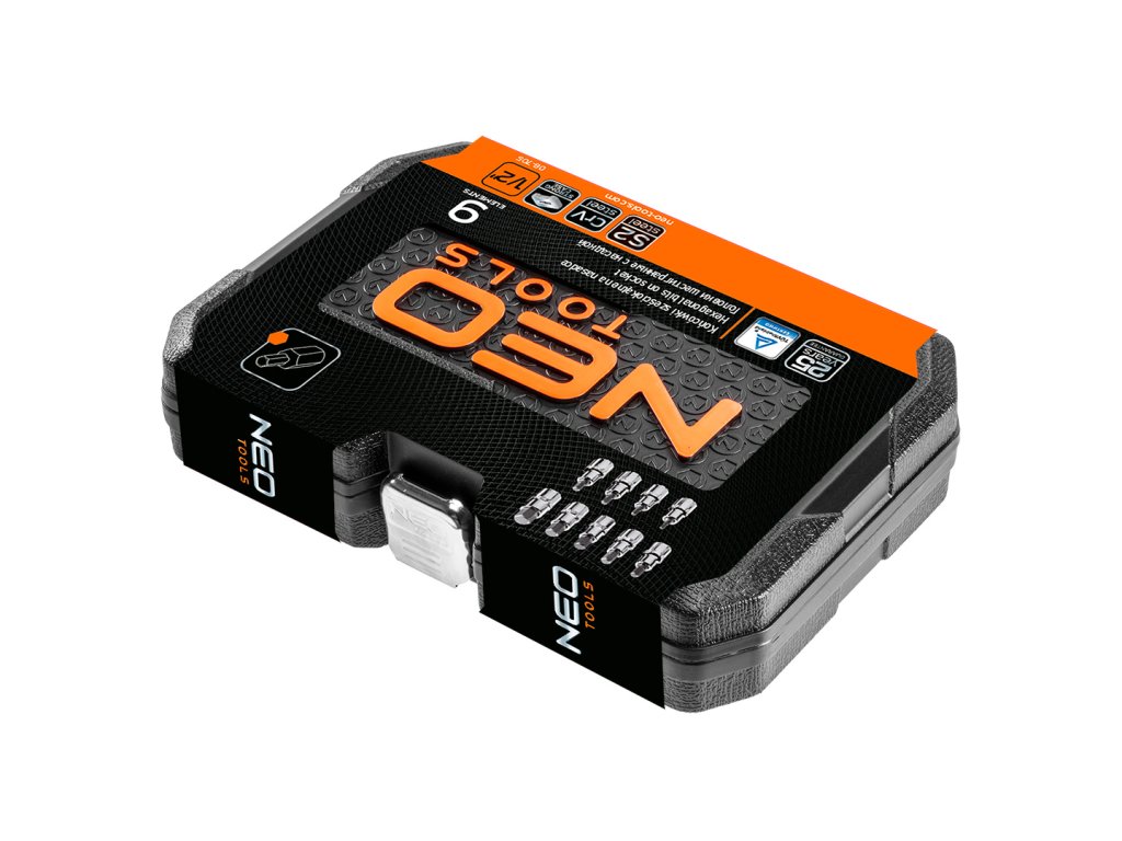 Sada šesťhranných bitov na 1/2" nástrčné hlavice NEO (ref. 08-705) pozostáva z 9 prvkov (vo veľkostiach od H4 do H17, dĺžka 55 mm). Zásuvky sú vyrobené z kvalitnej chróm-vanádiovej ocele. Vysoká odolnosť skrutkovacích bitov je zabezpečená použitím ocele S2. Celá súprava sa dodáva v praktickom kufríku. Kvalitu náradia potvrdzuje certifikát TÜV a 25-ročná záruka výrobcu. Značka NEO spĺňa očakávania profesionálov.