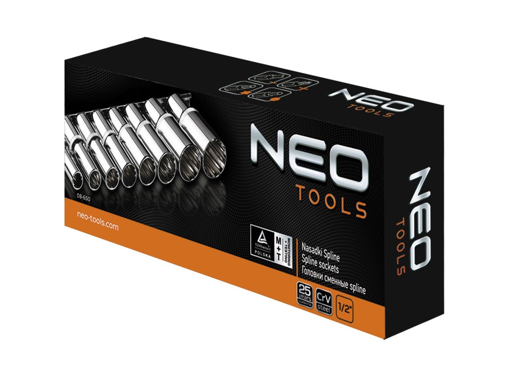 NEO dlhé 1/2" drážkové nástrčné hlavice (ref. 08-650) v súprave 8 kusov v obľúbených veľkostiach (od 10 do 24 mm). Vyrobené z odolnej chróm-vanádiovej ocele. Guľový tvar nástrčných hlavíc poskytuje široké možnosti použitia a umožňuje odskrutkovať skrutky torx, drážkové, 12-uholníkové, metrické, palcové a štvorhranné. Kvalitu nástroja potvrdzuje certifikát TÜV a 25-ročná záruka výrobcu. Značka NEO spĺňa očakávania profesionálov.