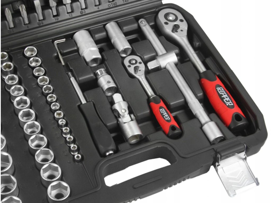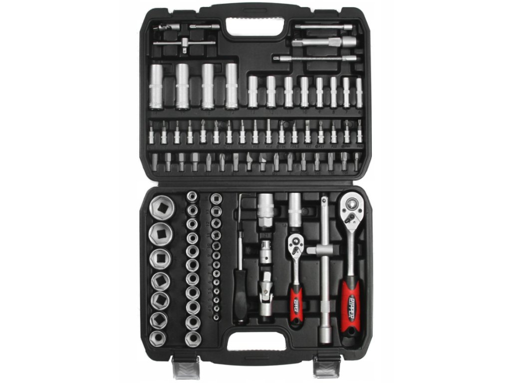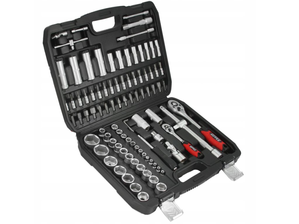 Gola sada nástrčných kľúčov z CRV ocele. Univerzálna sada obsahujúca 94 ks prvkov. Sada je určená pre amatérske a domáce použitie. Praktický plastový kufrík vám uľahčí manipuláciu s náradím. Nástrčné kľúče sa vyznačujú širokou paletou veľkostí a typov.