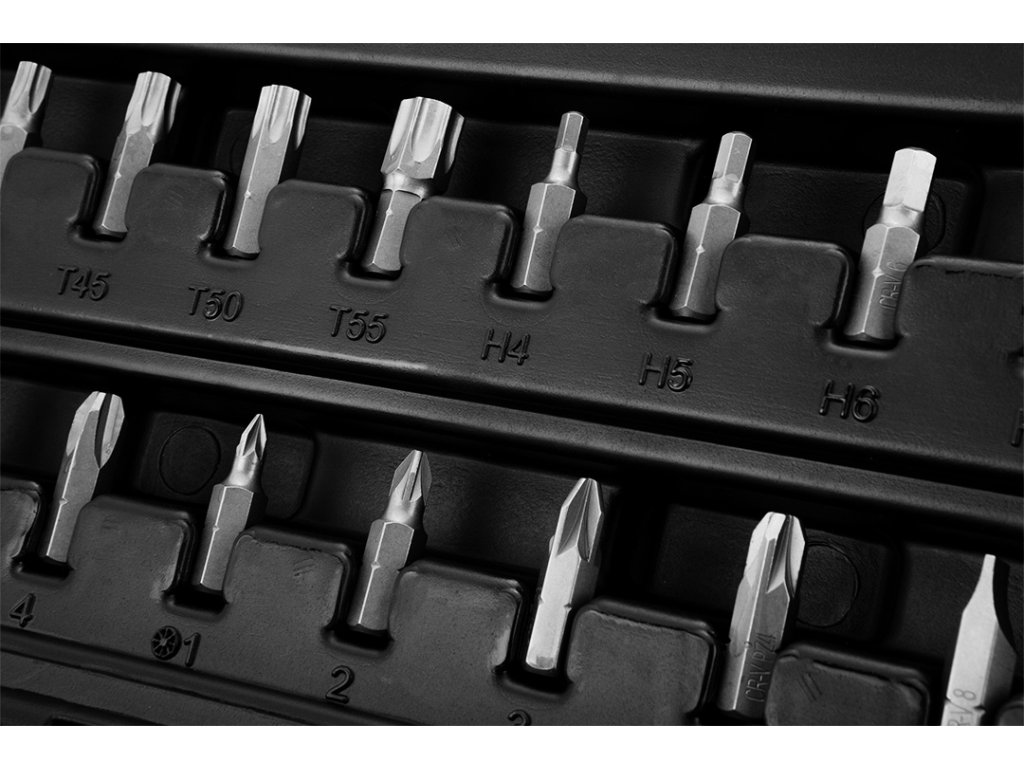 Nástrčné kľúče 58 ks, 1/2", CrV oceľ, šesťhranné nástrčné hlavice 1/2" 17 ks: 10, 11, 12, 13, 14, 15, 16, 17, 18, 19, 20, 21, 22, 24, 27, 30, 32 mm, dlhé šesťhranné hlavice 1/2" 8 ks: 10, 11, 12, 13, 14, 15, 17, 19 mm, račňa 1/2", 90 zubov, nástavce 1/2" 2 ks: 125 mm a 250 mm, sviečkové zásuvky 1/2" 2 ks: 16 mm a 21 mm, adaptér na bity 1/2" - 5, 16", univerzálny kĺb 1/2", redukcia 1/2", bity 5/16" 25 ks: TX20, TX25, TX30, TX40, TX45, TX50, TX55, HEX4, HEX5, HEX6, HEX8, HEX10, HEX12, HEX14, PH1, PH2, PH3, PH4, PZ1, PZ2, PZ3, PZ4, SL8, SL10, SL12, záruka 25 rokov.
