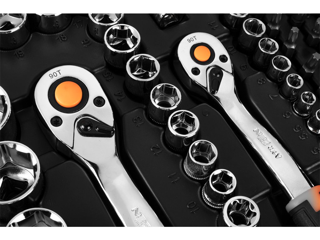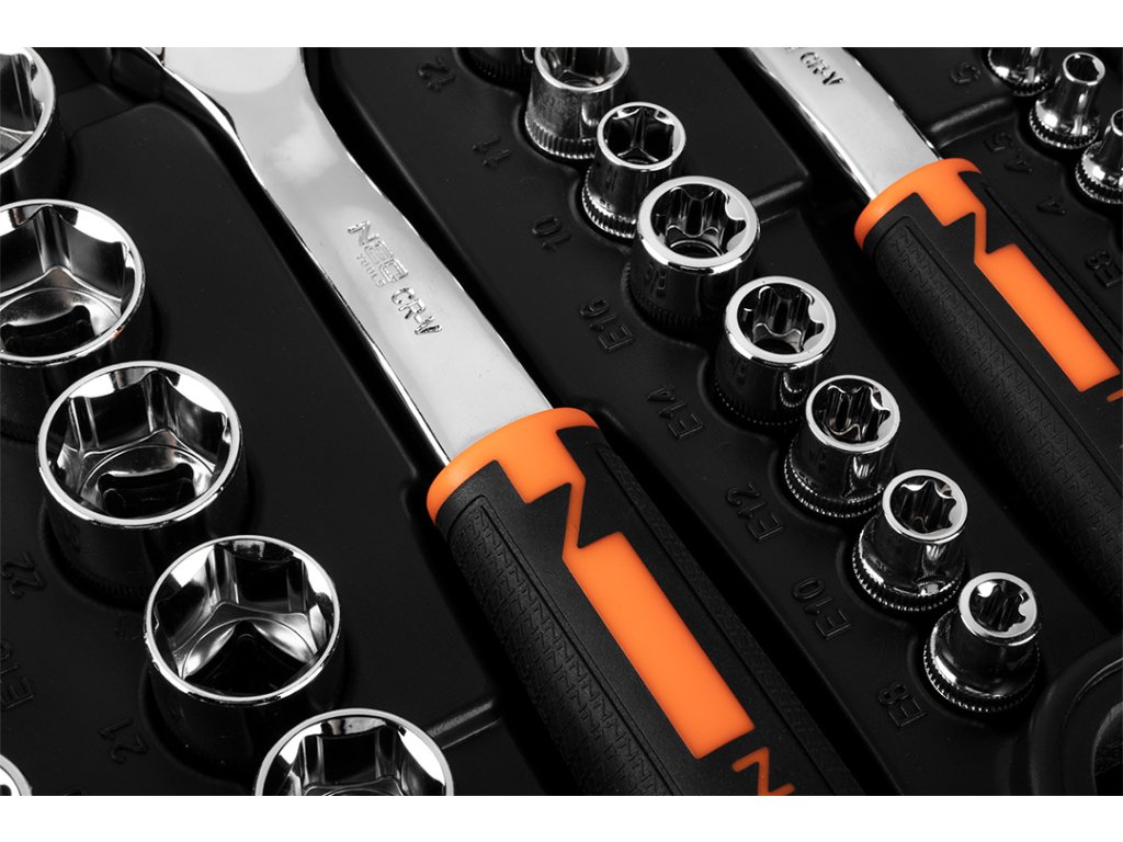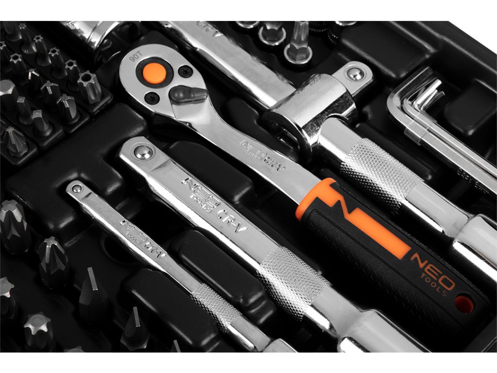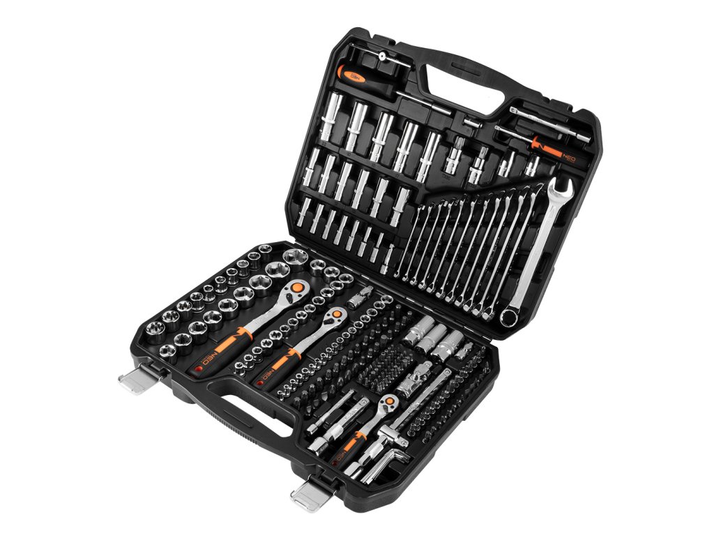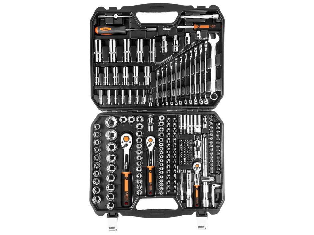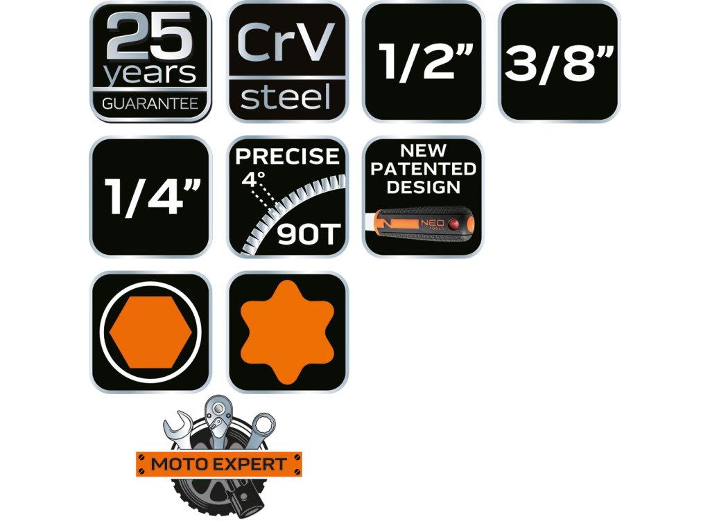 Sada nástrčných kľúčov NEO 1/2", 3/8" a 1/4" (ref. 10-076) pozostáva z 219 prvkov vyrobených z vysokokvalitnej chróm-vanádiovej ocele. Sada obsahuje račne 1/2", 3/8" a 1/4" (odolný račňový mechanizmus - 90 zubov) s ohnutými ergonomickými rukoväťami. Sada obsahuje rozsiahle balenie šesťhranných nástrčiek v dvoch dĺžkach s reliéfnym nápisom (vo veľkostiach od 4 do 32 mm), nástrčiek Torx (E4 - E24) a skrutkovacích bitov (plochých, krížových, šesťhranných, Torx). Okrem toho kufrík obsahuje kombinované kľúče (12 kusov, 8 mm - 19 mm), držiak bitov, 1/4" rukoväť skrutkovača. Túto ponuku dopĺňa široká škála príslušenstva. Vertikálne usporiadanie prvkov v skrinke umožňuje rýchlejšie skompletizovať potrebnú súpravu. Kľúče sa dodávajú v praktickom a robustnom plastovom puzdre s kovovými sponami a praktickou rukoväťou. Spoľahlivosť výrobku potvrdzuje 25-ročná záruka a certifikát TÜV Rheinland M+T. Značka NEO spĺňa očakávania profesionálov.
