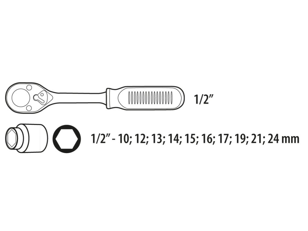 Sada nástrčných kľúčov 1/2", 1 1/2": račňa 190 mm, dvojmateriálová rukoväť, 24 zubov, otočný spínač, 10 šesťhranných nástrčných hlavíc, veľkosti: 10, 12, 13, 14, 15, 16, 17, 19, 21, 24 mm, plastový záves