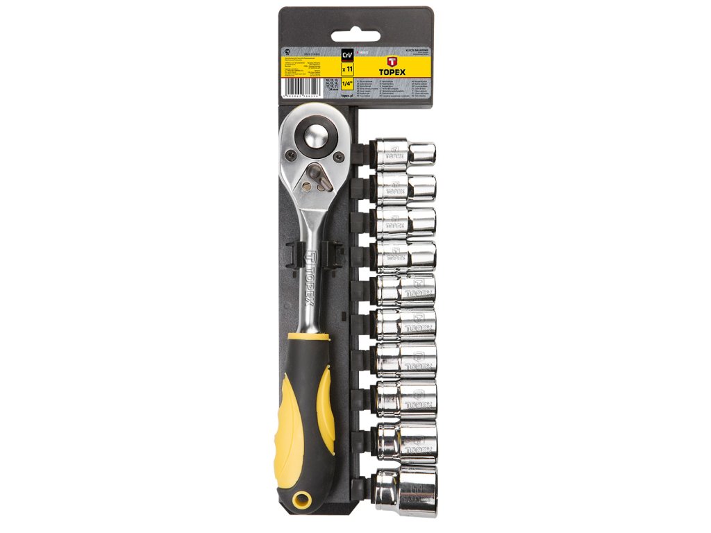 Sada 1/2" nástrčných kľúčov TOPEX (ref. 38D652) má všestranné využitie pri drobných montážnych prácach, opravách vozidiel a strojov a ďalších prácach v domácnosti a garáži každého domáceho majstra. Všetky prvky sú vyrobené z vysokokvalitnej chróm-vanádiovej ocele, ktorá zaručuje dlhú životnosť nástroja. Súprava obsahuje račňu s ergonomickou plastovou rukoväťou potiahnutou protišmykovým materiálom, ktorá zaručuje pohodlie a bezpečnosť pri práci, a 10 šesťhranných nástrčných hlavíc. Všetko je umiestnené na praktickom plastovom vešiaku. Značka TOPEX je určená pre domácich majstrov.