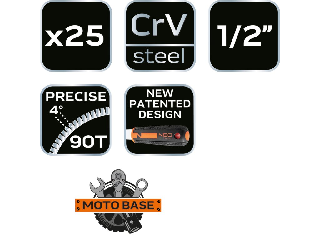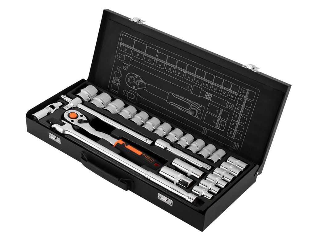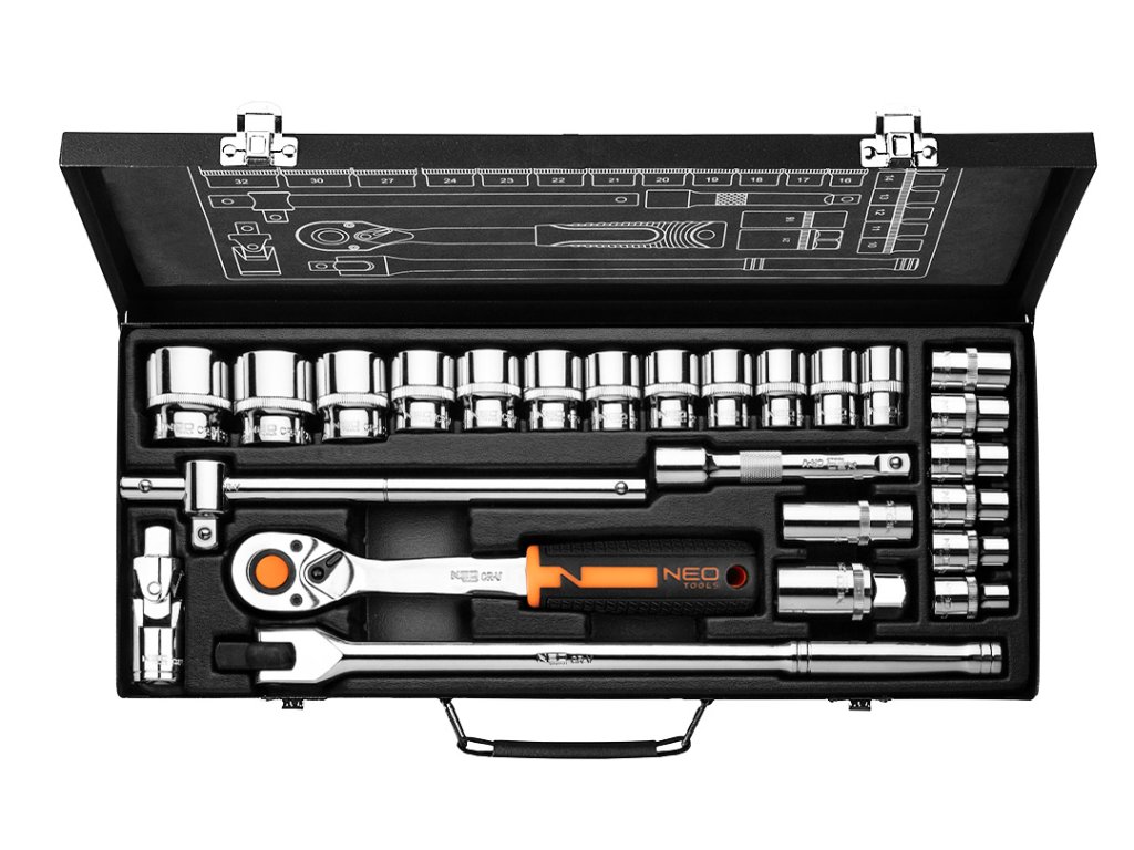 Sada 1/2" nástrčných kľúčov NEO (ref. 10-036) pozostáva z 25 prvkov z vysokokvalitnej chróm-vanádiovej ocele. Sada obsahuje račňu 1/2" (odolný račňový mechanizmus - 90 zubov) s ohnutou ergonomickou rukoväťou a širokou škálou šesťhranných nástrčných hlavíc s reliéfnym nápisom (18 kusov, vo veľkostiach od 10 do 32 mm). Je doplnený o balenie príslušenstva: dve sviečkové zásuvky (16 mm a 21 mm), univerzálny kĺb, predĺženie, gombík s ovládačom, rukoväť s kĺbom. Celý balík sa dodáva v praktickom kovovom kufríku s pevnými západkami. Spoľahlivosť výrobku potvrdzuje 25-ročná záruka a certifikát TÜV Rheinland M+T. Značka NEO spĺňa očakávania profesionálov.