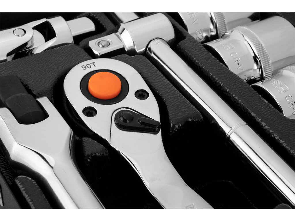 Nástrčné kľúče 25 ks, 1/2", CrV oceľ, šesťhranné hlavice 1/2" 18 ks: 10, 11, 12, 13, 14, 15, 16, 17, 18, 19, 20, 21, 22, 23, 24, 27, 30, 32 mm; račňa 1/2", 90 zubov, 1 ks; sviečkové nástrčky 1/2": 16 mm, 21 mm; 1 ks 250 mm hnací gombík; 1 ks 125 mm predĺženie; 1 ks 360 mm kĺbový gombík; 1 ks univerzálny kĺb. 25-ročná záruka. Certifikát TÜV Rheinland M+T.