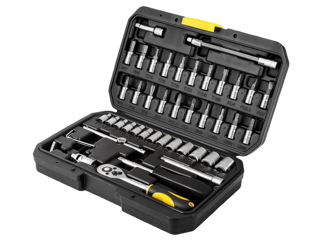 Nástrčné kľúče 46 ks, 1/4", bity na nástrčky 1/4", 21 ks: PH1, PH2, PH3, PZ1, PZ2, PZ3, HW3, HW4, HW5, HW6, HW7, HW8, T10, T15, T20, T25, T30, T40, FD4, FD5.5, FD7 1/4" zásuvky 13 ks: 4, 4,5, 5, 5,5, 6, 7, 8, 9, 10, 11, 12, 13, 14 mm, šesťhranné kľúče 4 ks: 1,27, 1,5, 2,0, 2,5 mm, predĺženie 1/4" 2 ks. 50 mm a 100 mm, ohybný nadstavec 1/4", račňa 1/4" 45T, T-rukoväť 1/4", držiak bitov 1/4", univerzálny kĺb 1/4", skrutkovací adaptér