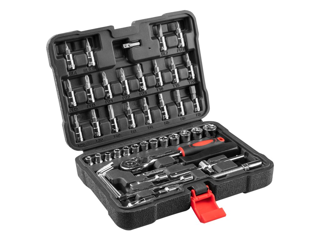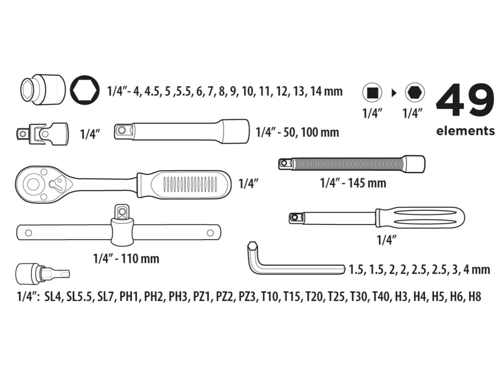 Sada nástrčných kľúčov (38D570) TOP TOOLS 1/4"pozostávajú z 49 prvkov: račňa 1/4 24 zubov, rukoväť skrutkovača 1/4 150mm, typ T 110mm gombík, elastické predĺženie 1/4 145mm, predĺženie 1/4 100mm; predĺženie 1/4 50mm, 1/4 kĺb: 1/4 zásuvka: 4mm, 4,5mm, 5mm, 5,5mm, 6mm, 7mm, 8mm, 9mm, 10mm, 11mm, 12mm, 13mm, 14mm, adaptér pre 1/4 skrutkovač bity na uzávere: Sl4, SL5.5, SL7, PH1, PH2, PH3, PZ1, PZ2, PZ3, T10, T15, T20, 1,5 mm, 1,5 mm, 2 mm, 2 mm, 2,5 mm, 2,5 mm, 3 mm, 4 mm;
